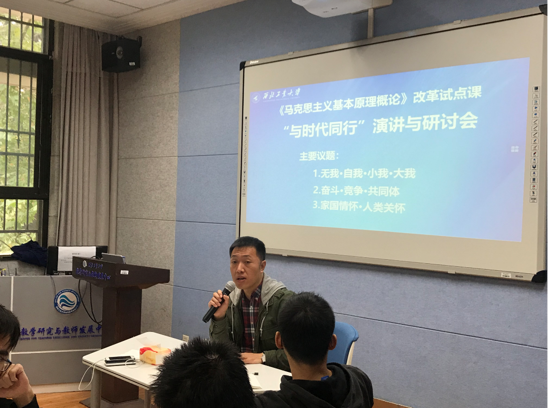 在继前几次课程采用集体辩论、课堂参与互动、小组讨论、雨课堂等员工参与形式的创新后,今天的课,马军老师结合正在讲授的唯物史观内容,巧妙将演讲与学术研讨结合起来,组织题为“与时代同行”的演讲与研讨会,并设置了“无我·自我·小我·大我”“奋斗·竞争·共同体”“家国情怀·人类关怀”三个议题,引导大家运用唯物史观以及马克思主义的基本立场、观点和方法进行演讲和辩论。
