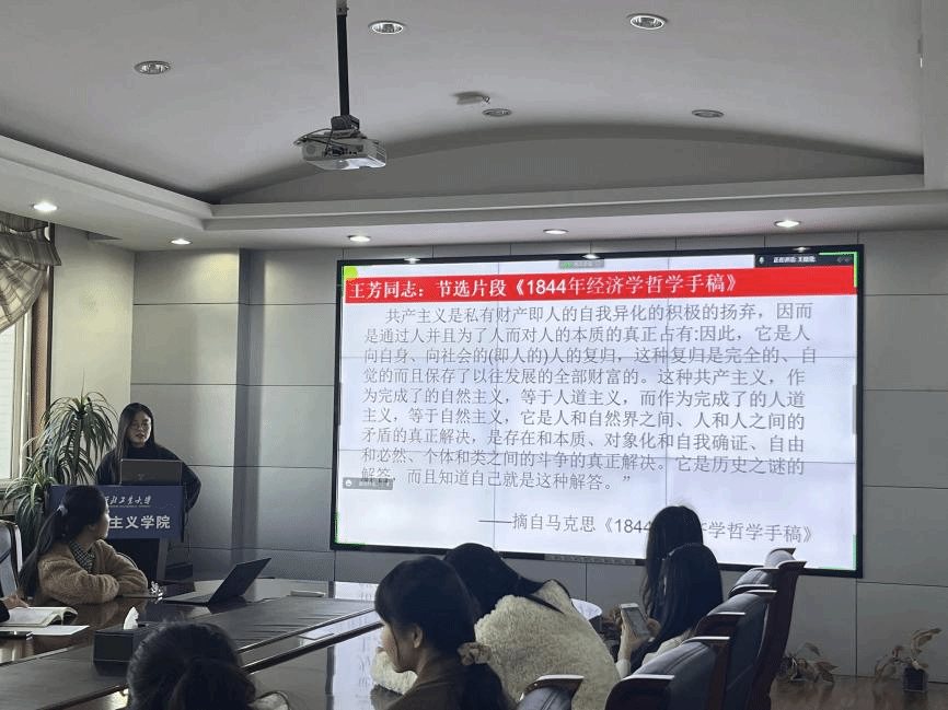 在支部品牌活动“读原著学原文悟原理知原义”诵读会环节,王芳同志分享解读了马恩经典著作《1844年经济学哲学手稿》中的精彩片段,指出了私有财产是人的自我异化的产物,要对私有财产进行“积极的扬弃”;阐明了对共产主义的深刻认识与坚定信仰,要使人摆脱以往非人性的社会制度进而通往关切人类福祉的共产主义社会;最后勉励大家要坚定共产主义信仰,“不忘初心、牢记使命”做有信仰敢担当的青马先锋。