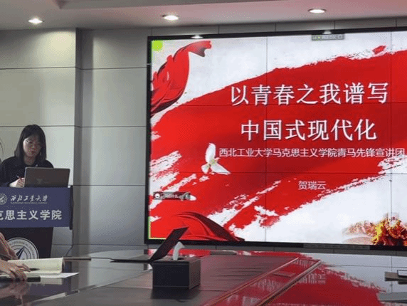 活动伊始,由青马先锋宣讲团成员顿昱璇同学和贺瑞云同学进行党的二十大精神宣讲。顿昱璇同学带来题目为“聚焦党的二十大 体会时代新思想——‘以中国化时代化的马克思主义行’为切口”的宣讲,她从概念分析入手,深入探析中国共产党“能”归根到底是因为中国化时代化的马克思主义“行”,进一步阐明中国化时代化马克思主义“行”的内在机理。贺瑞云同学以“以青春之我谱写中国式现代化”为题,介绍了中国式现代化的内涵、实现路径以及中国式现代化中的当代青年,特别是西工大青年在中国式现代化中彰显的青春力量。