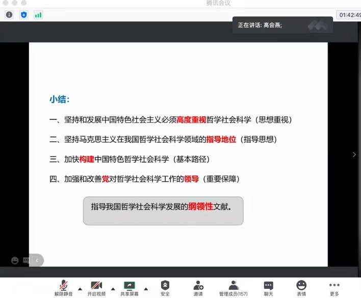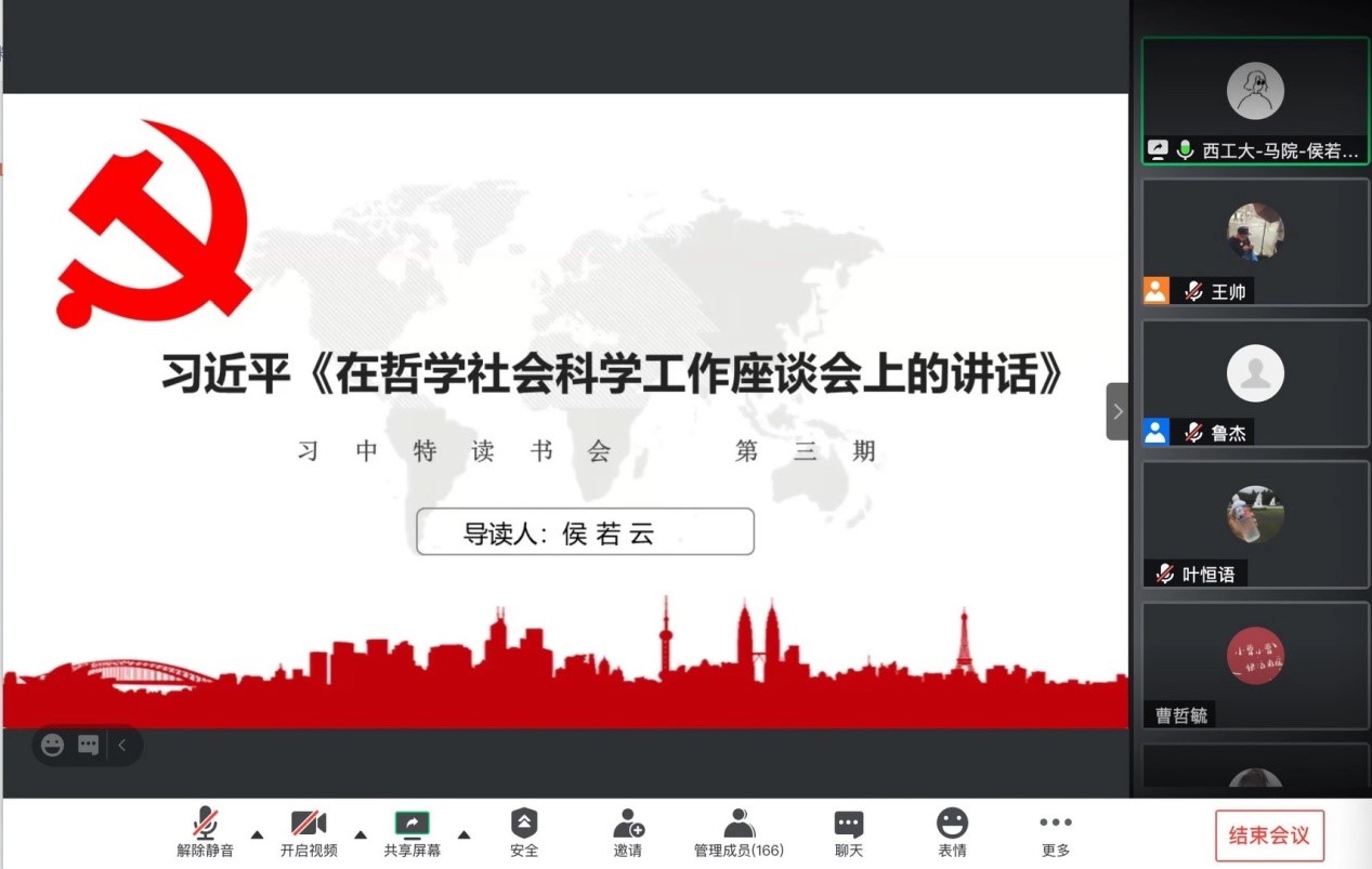 习近平新时代中国特色社会主义思想学习读书会自成立以来越来越受到老师同学欢迎热爱,本次活动更是创下自举办以来的参与人数新高,相信未来还会有越来越多的老师和同学加入。两位老师希望借助本次读书会这个契机,让同学们在阅读中思考,在交流中进步,助力我国哲学社会科学的进步发展,让更多的青年老员工用习近平新时代中国特色社会主义思想武装头脑、指导行动,争取早日实现中华民族伟大复兴。