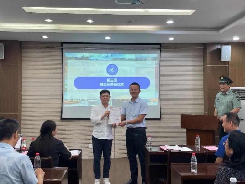 在班主任聘任仪式上,经理书记为新生班主任颁发证书。