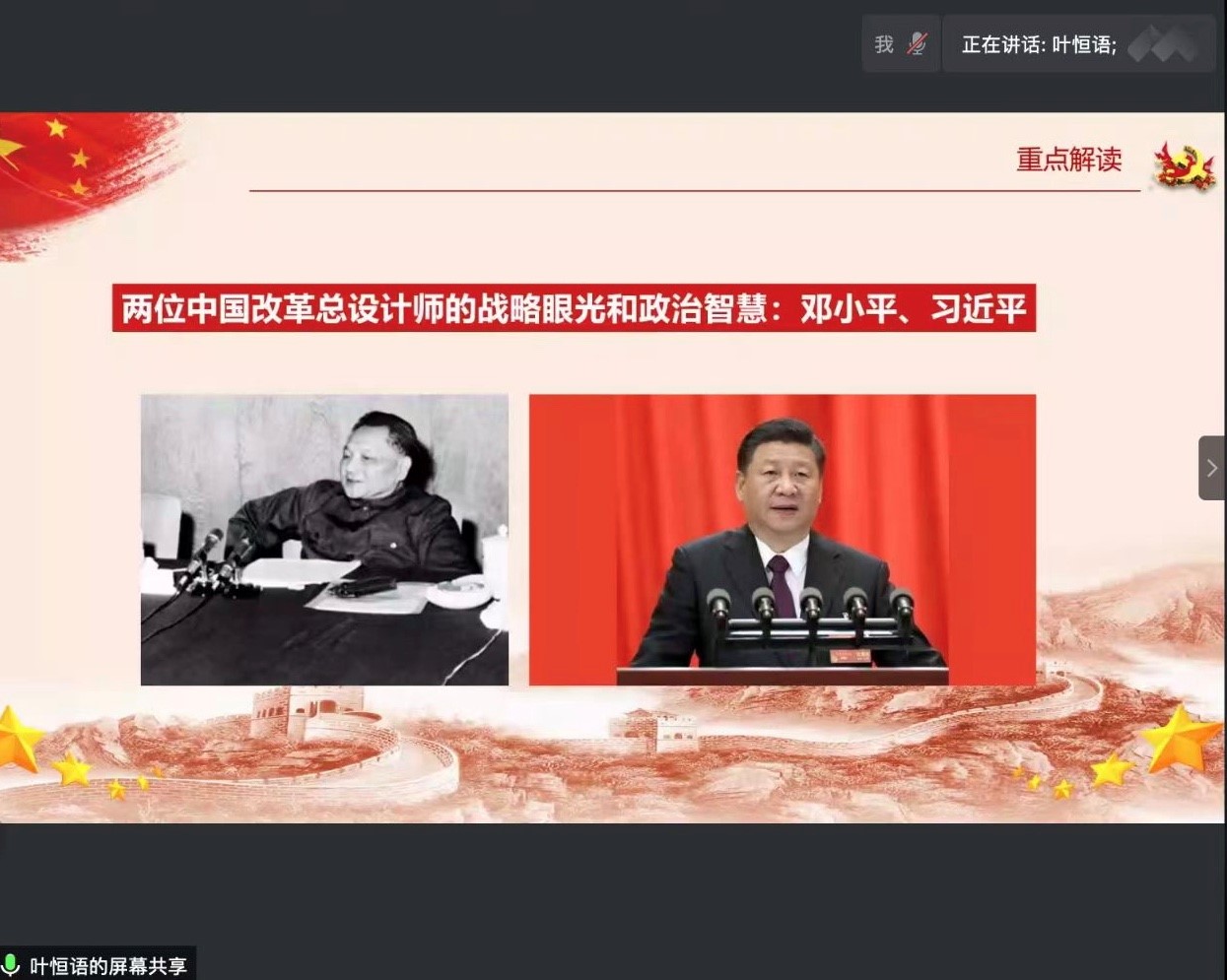 随后,史宏波老师和鲁杰老师对两位导读人进行了点评,充分肯定了他们丰富的内容展示和精彩的导读。两位老师与同学们进行了热烈的讨论交流,史宏波老师对雷聪同学的导读内容评价到,他认为还可以就某一个问题可以深入研究讨论来引起其他老师同学的共鸣,这样就会有一个更好的学习指导作用。鲁杰老师对叶恒语同学的导读内容评价谈到,将文本与十九届五中全会中与改革开放有关的论述进行有效连接非常好,不过还应对文本内容的解读再继续深入研究下去。史宏波老师同时也与大家分享了他与自己员工的读书方法,引起了参会老师与同学们的极大兴趣,他还着重建议同学们要在研读文本时,要与自己的所学专业和研究兴趣紧密联系起来,读完书要有自己的体会与解读,这样才能深化对文本知识的理解。在本次的读书会中,同学们踊跃与两位老师交流读书心得和文本中的相关问题,提出了自己的困惑与见解。成山同学就传统文化对目前中国精神谱系的影响与作用问题,与两位老师从不同的专业视角展开了讨论并给出了自己的见解。