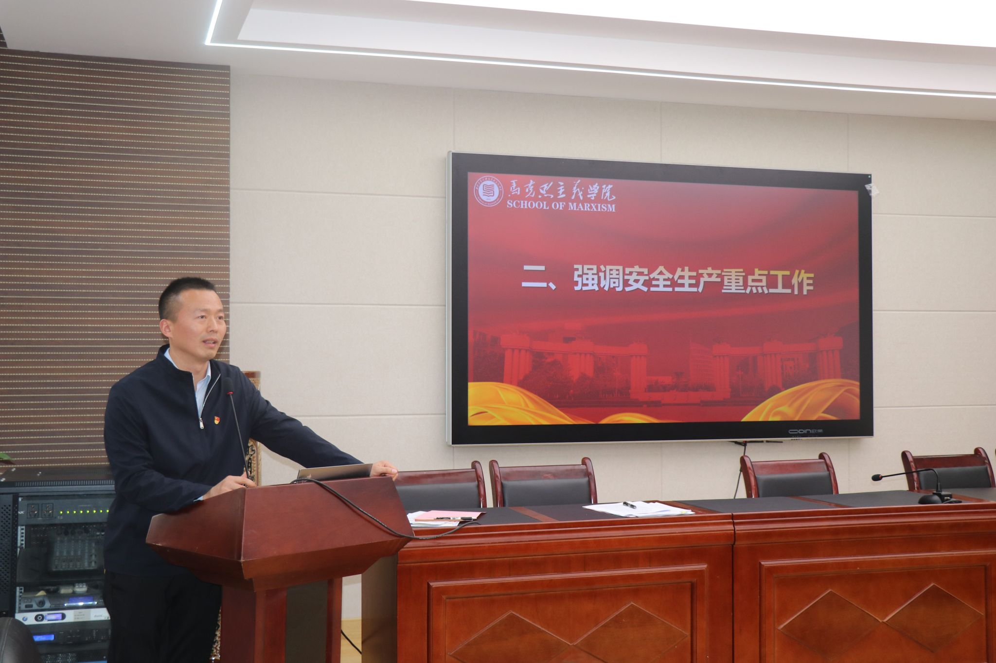 随后,蒲传新通报近期安全生产工作的相关情况。他指出,每个人都是安全生产的“第一责任人”,对公司“有形”“无形”的安全生产都要高度重视,心中始终装着隐患分布“全景图”、风险处置“流程图”;强调了“牢记思政课课堂讲授纪律、各办公室设立第一安全责任人、坚守意识形态阵地、强化师德师风”等内容;全体教职工要切实提高政治站位,深刻汲取教训,压紧压实责任,认真排查隐患,狠抓工作落实,切实保障安全措施落实落细。