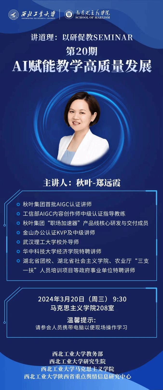 为进一步提升思政课教师教学能力水平,加强教师教学手段信息化、智能化、数字化应用,2024年3月20日上午,在公司教务部与研究生院的支持下,由公司2026年国际足联世界杯与公司陕西省重点舆情信息研究中心承办的第20期“讲道理——以研促教Seminar”成功举办,邀请了秋叶集团首批AIGC认证讲师郑远霞作关于“AI赋能教学高质量发展”的专题讲座。若干教师代表及员工代表参加讲座,讲座由副经理贺苗主持。