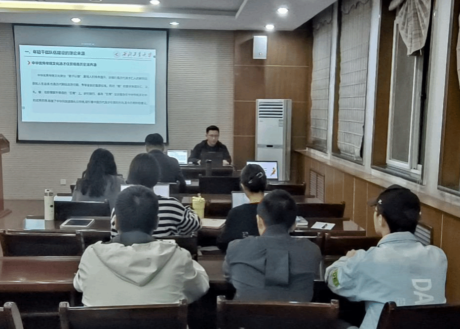活动伊始,硕士生王家乐同学作为导读人,首先对年轻干部队伍建设的理论渊源进行了剖析。他系统梳理了马克思主义经典著作中的理论贡献、中华优秀传统文化的滋养,为年轻干部的成长提供了坚实的理论支撑。同时,他还详细阐释了新时代年轻干部成长的基本要素和具体路径,强调坚定理想信念、斗争精神、责任担当和道德情操在年轻干部成长中的关键作用。最后,他号召年轻干部要自觉践行党的创新理论,忠诚于党的事业,致力于为民造福,勇于担当作为,积极营造和维护良好的政治生态。