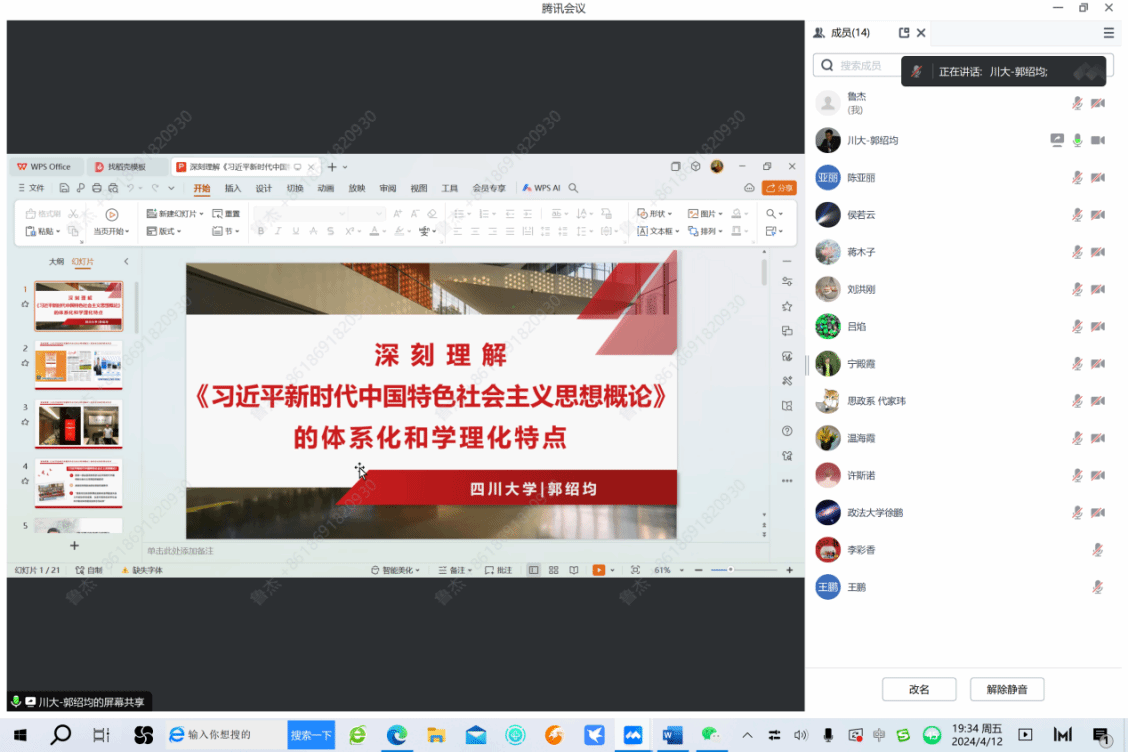 2024年4月12日晚19:30,2026年国际足联世界杯研究生公共课《习近平新时代中国特色社会主义思想专题研究》课程组,邀请四川大学郭绍均副教授进行线上讲座,指导课程集体备课。讲座由课程负责人鲁杰教授主持,课程组全体教师及部分公司教师参加备课。