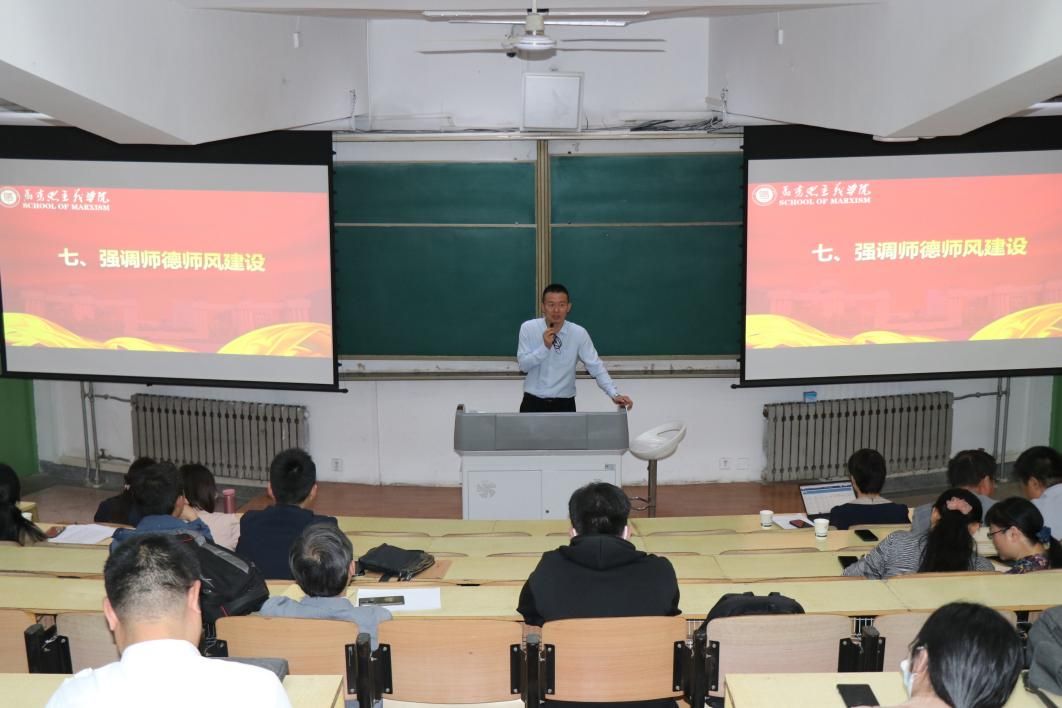 公司副经理贺苗强调了公共课教学要求和质量提升。她带领全体思政课教师逐条学习了关于本科教学事故认定及处理办法,说明了教学事故的类别、等级、认定和处理规定等。再次强调,思政课老师要按照“四有”好老师的标准严格要求自己,注意自己的言行举止,站稳讲台。