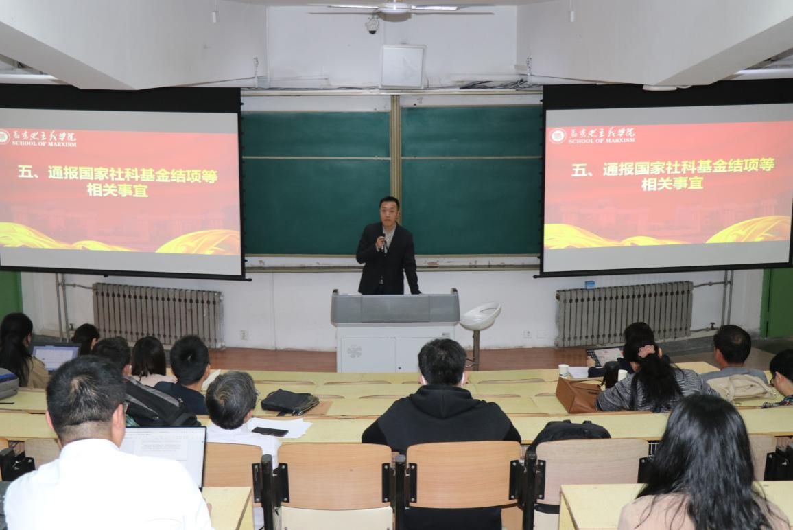 经理助理马军通报国家社科基金结项等相关事宜。他指出,重大项目招标和年度项目申报有了新的要求,各位老师务必关注相关通知做好申报工作,并且为各位老师介绍了结项和申报要求。