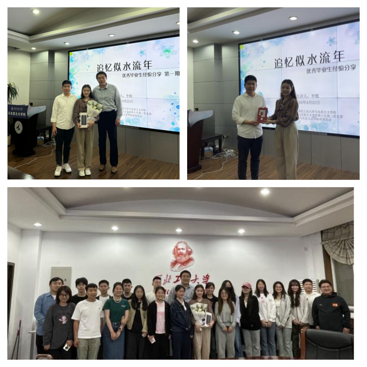 最后,李刚老师总结谈到,价值观直接影响人生目的、人生意义等问题的思考,影响人生道路的选择。人生的价值是在正确选择、奋勇拼搏中创造出来的,无论是硕士生还是博士生,都要做好人生的选择,坚持自己选择的道路。分享会的最后,李刚老师和李水同志代表公司和博士生第二党支部向李懿赠送纪念礼品,李懿向公司赠送《马克思为什么是对的》一书,并进行合影留念。