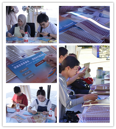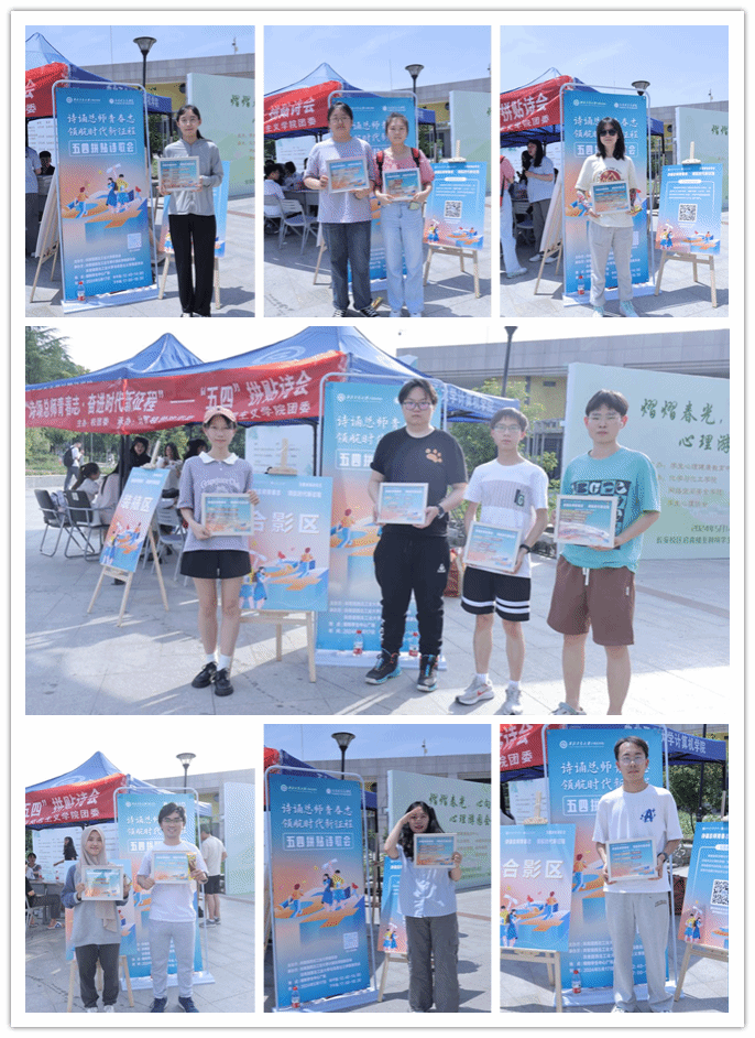 当拼贴诗的创作达到尾声,每一位参与者都怀着满满的成就感,轻轻地将自己精心创作的成品放入事先发放的相框中。这不仅仅是一个简单的装裱过程,更是对自己辛勤付出和创意的珍视与尊重。紧接着,在合影留念环节,大家纷纷拿着作品在合影区拍照打卡。这一刻,每个人都成为艺术的创作者和见证者,共同见证着五四精神的时代传承。