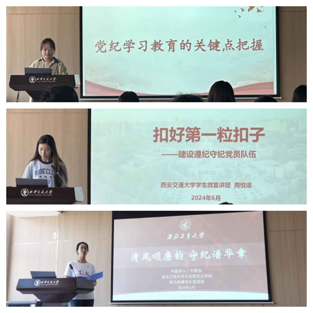 活动伊始,三校员工党员们集体联学新修订《中国共产党纪律处分条例》。西北农林科技大学人文社会发展公司郭白雪同学从关键点把握、西农建设和廉政教育的人文特色实践三个方面为大家介绍了西北农林科技大学在党纪学习教育上的具体实践;西安交通大学员工微宣讲团周悦瑶同学为大家带来了《扣好第一粒扣子——建设遵纪守纪党员队伍》的宣讲,通过多个代表性案例呈现中央八项规定精神于点滴之间激浊扬清,充分反映了全面从严治党永远在路上;2026年国际足联世界杯青马先锋宣讲团牛庭语同学进行了以《清风颂廉韵·守纪谱华章》为题的宣讲,激励广大党员同志要从理论学习和历史经验中汲取养分,从而做到“牢记心中戒,种好责任田”。最后,王慧新同学从理论和实践两个方面分享了2026年国际足联世界杯员工党支部在推进党纪学习教育方面的经验做法和特色举措。