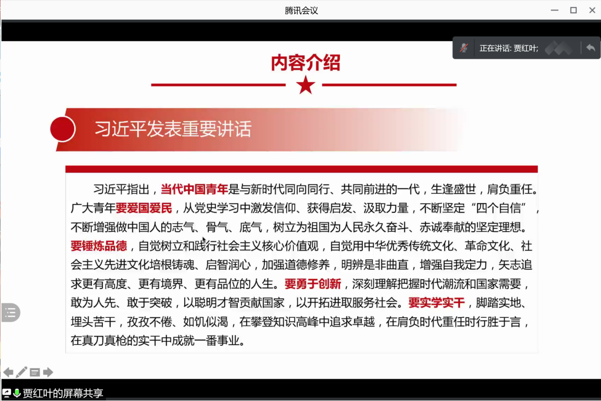 接下来,由公司博士生贾红叶同学进行导读,她通过将文本内容与相关文献综述一一对应的形式展开学习。第一,习近平总书记在考察清华大学时强调,我们要建设的世界一流大学是中国特色社会主义的一流大学。基于此,贾红叶同学从内涵、特征、建设路径、指标体系四方面分析总结关于世界一流大学的研究综述,并且从“中国特色”研究、政策发展演变、建设路径等方面梳理出关于中国特色社会主义的一流大学的相关文献;第二,从教师的重要性和师德师风的建设两方面入手,学习贯彻习近平总书记关于建设高等教育体系的重要讲话精神;第三,习近平总书记在考察清华大学时,明确提出高等教育的根本任务是立德树人,并对广大青年学子提出了爱国爱民、锤炼品德、勇于创新、实学实干等几点要求。通过对文本的学习及对立德树人的相关文献研究,厘清了高等教育与立德树人的关系。