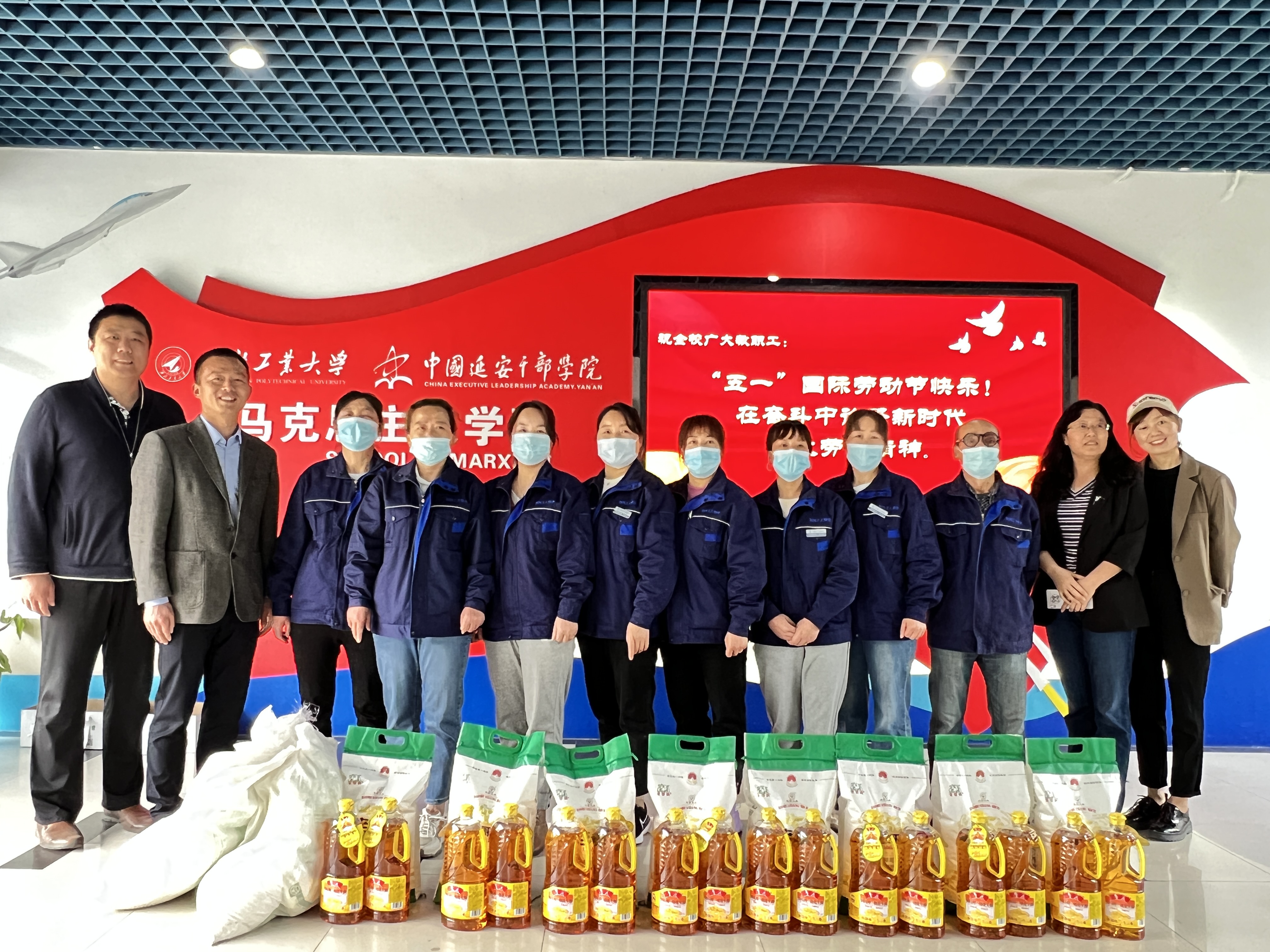 在五一国际劳动节到来之际,公司党委副书记(主持工作)蒲传新、公司工会主席高旭红,代表全院师生看望慰问了公司楼的物业值班工作人员,送上生活物资和节日礼物并预祝马院全体人员度过一个舒心快乐安全的假期!