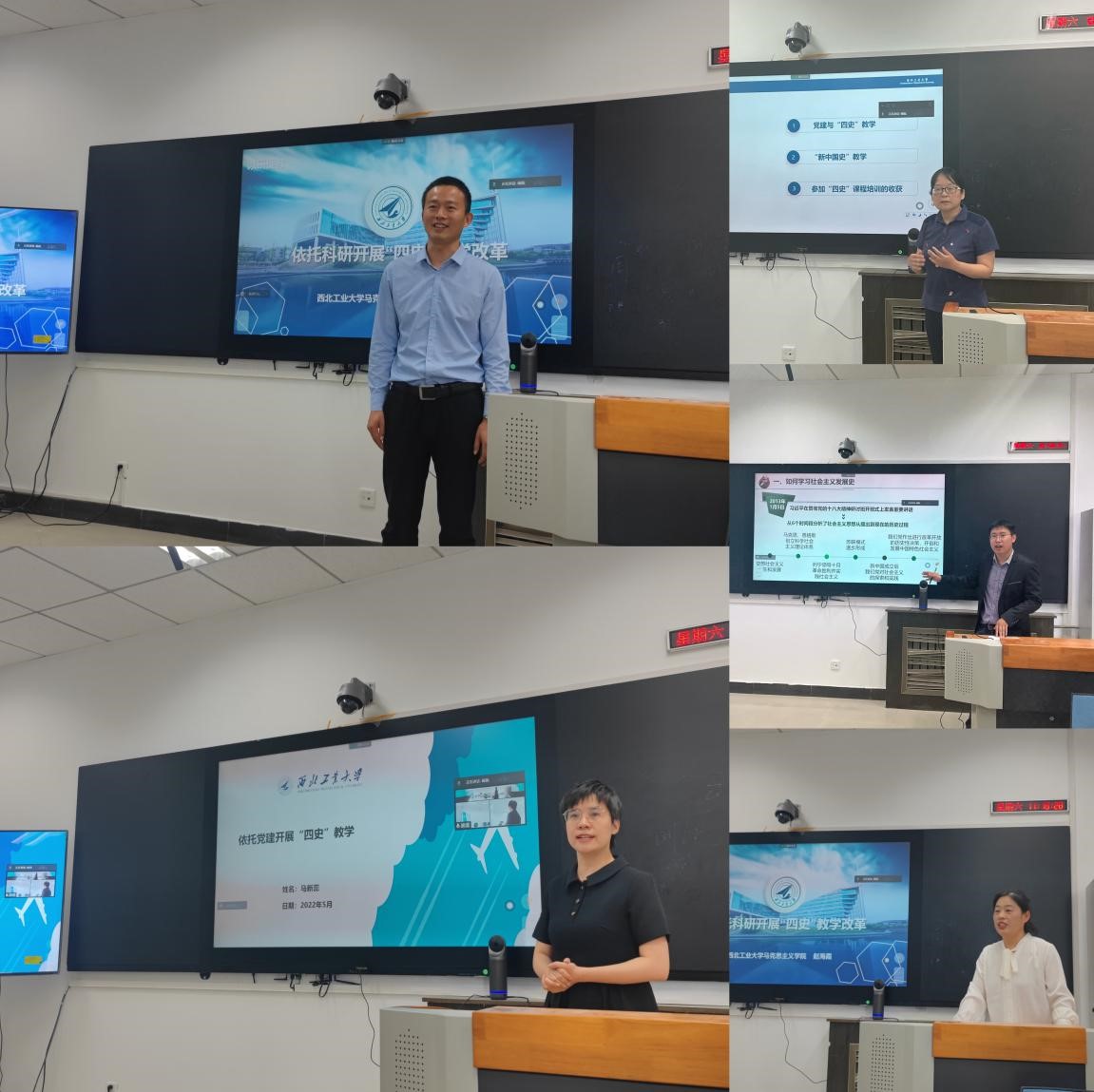 在教研分享环节,《新中国史》课程负责人马新蕊副教授做了依托党建开展“四史”教学的分享,指出以支部建设为契机,推动”四史“教学、科研、社会服务等功能于一体,以习近平总书记大历史观为根本遵循,准确把握新中国史的主线,积极回应员工关注,及时纠偏。《社会主义发展史》课程负责人山磊助理教授做了课程思政与思政课程协同推进“四史”课程建设的分享,认为只有通过全方位引入思政育人要素,使广大本科生在学习专业课程的同时,正确认识社会主义发展的历史主题、历史脉络、历史规律,牢固树立对马克思主义的信仰、对共产主义和社会主义的信念。《中共党史》《改革开放史》课程负责人赵海霞副教授,对“四史系列课程”教学团队依托科研开展课程建设情况,存在的问题及以后的教学工作规划进行分享,认为“四史”系列课程教学离不开教师们对相关内容的研究,教师需坚持历史审视与现实观照相关联,进一步加强四史相关的研究,持续挖掘思想政治理论背后的历史文化底蕴,持续拓展话语边界,切实提升思政课教学的实效性。公司党委书记蒲传新指出:“在中国特色社会主义进入新时代的历史方位下,加强高校的党史、国史、改革开放史和社会主义发展史教育,必须以党的教育方针为基础,以立德树人为中心任务,帮助员工树立崇高理想,培养更多德智体美劳全面发展的社会主义建设者和接班人。”