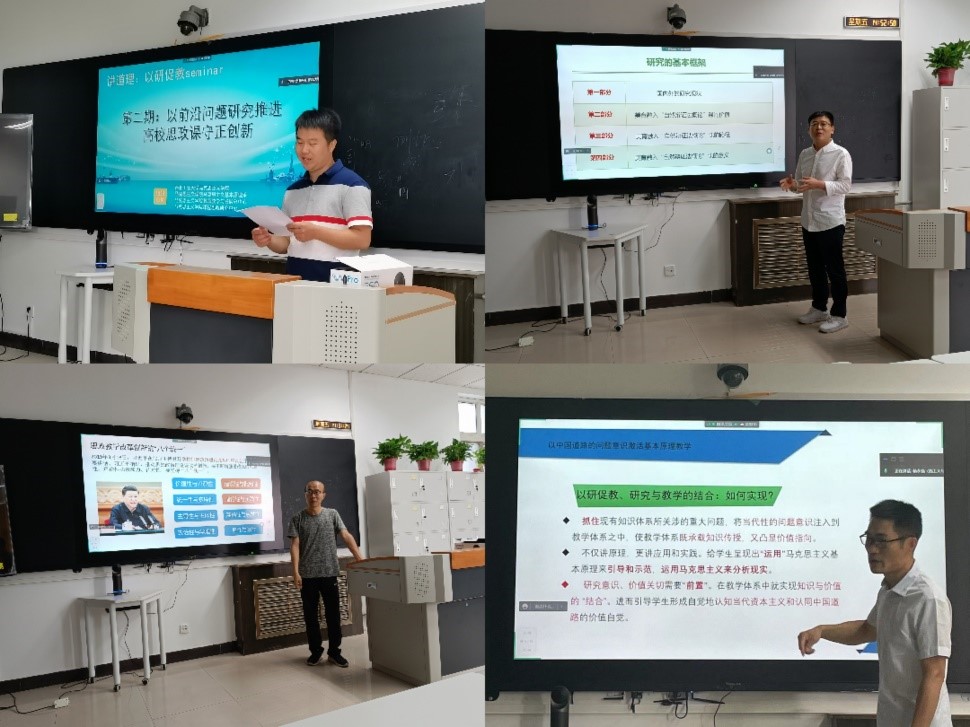 在“教研分享”环节,来自马克思主义基本原理系的四位青年教师结合自身教学与科研经历,以及5月13日—15日在中国延安干部公司的研学感悟,集中分享了对“以前沿问题研究推进高校思政课守正创新”的理解。聂阳副教授立足对数字资本主义、全人类共同价值等问题的研究,阐述了以中国道路的问题意识激活基本原理教学的必要性、可行性和具体的方式方法。吴鑫助理教授根据习近平总书记在公司思想政治理论课教师座谈会上的重要讲话精神,辨析了马原理教学中“建设性与批判性”、“实践性与理论性”相统一的问题。齐承水助理教授创新性地探析了新时代美育融入“自然辩证法概论”课的价值与路径,在注重“真”与“善”的同时,将“美”的理念和维度带入科技哲学的讨论之中。杨永强助理教授从空间政治学的视角出发,阐释了大变局时代资本主义全球政治规划的狡计,以及人类命运共同体理念的超越性,分析了在原理课教学中融入前沿问题研究的方式。