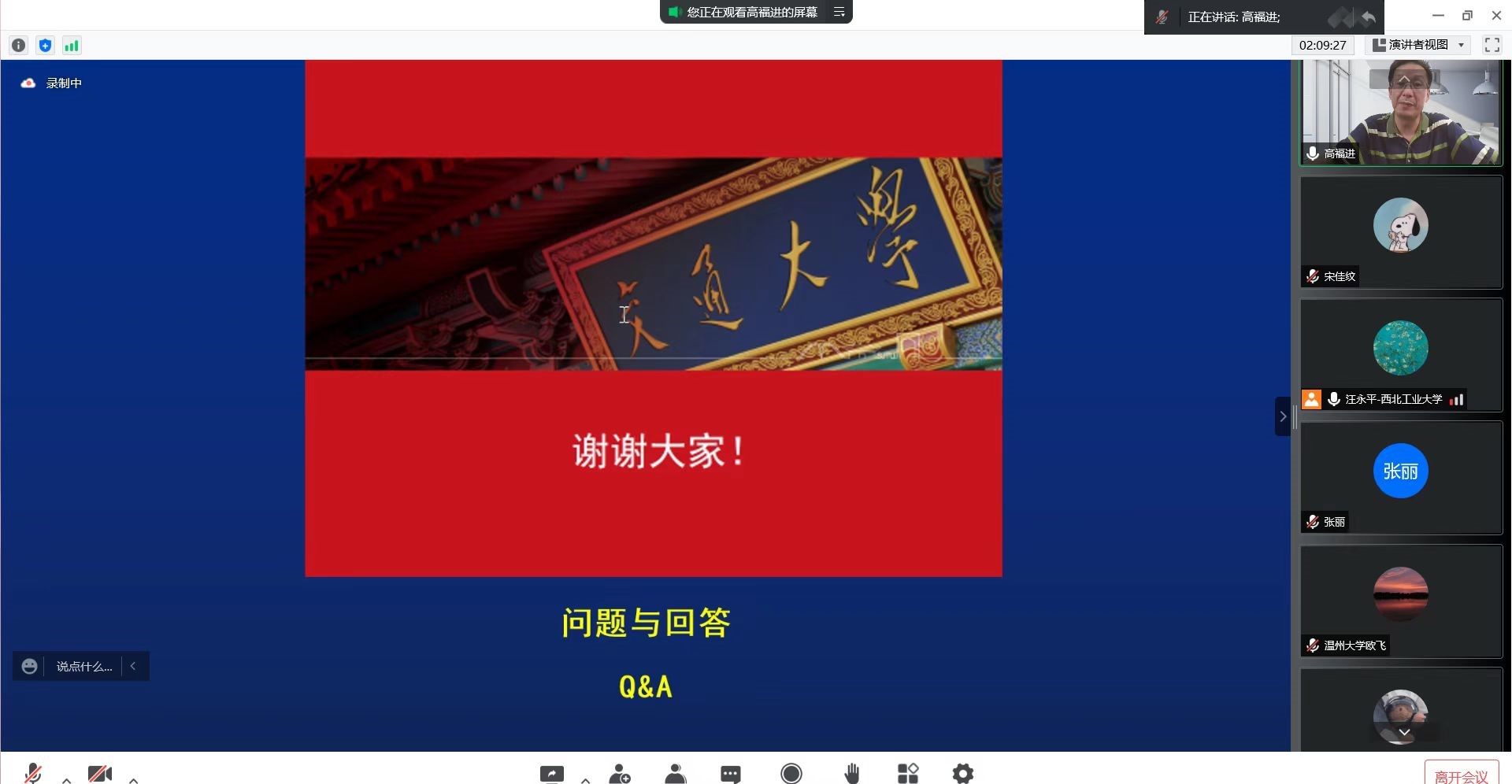 紧接着是师生互动环节,与会师生针对自己的困惑积极发言,进行提问,高福进教授也就高校教师在进行四史授课的过程中如何开展教学活动、把握侧重点等内容进行了细致的讲解,使大家收获颇丰。