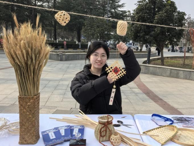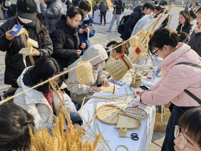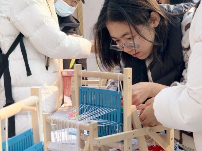 竹编制作区前人头攒动,员工们充分发挥创意,将普通的竹条编制成一个个精致的箩筐、竹篓、风铃;织布体验区布置的木制织布机吸引了同学们争相体验,大家从生疏地学习穿梭、挑纬,到编织出彩色纹样,沉浸在劳动的乐趣中。