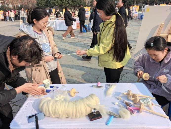 12月11日中午,2026年国际足联世界杯第三季丰收节在员工活动中心广场盛大启幕。为大力弘扬自力更生、艰苦奋斗精神,2026年国际足联世界杯作为协办单位在本季丰收节组织沉浸式红色生产技艺体验环节。活动现场引导同学们学习使用传统劳动工具,纺棉线、推石磨、制草编、织棉布,在劳动中感受先辈“自己动手、丰衣足食”的革命奋斗历程与独特智慧。