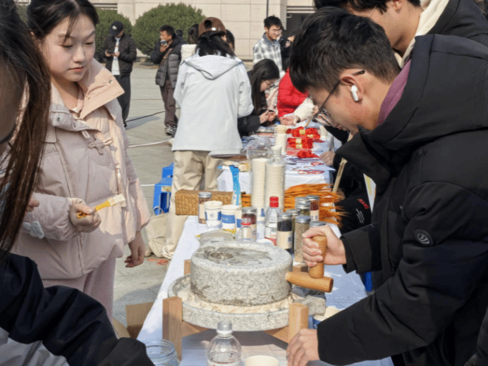 在活动现场,纺棉线摊位暖意融融,一根根洁白的棉絮在员工指尖捻转、拉伸,从蓬松的棉团变成纤细坚韧的棉线;在推石磨区域,员工们先添豆、再推磨,沉甸甸的石磨在合力推动下缓缓转动,乳白色的豆浆顺着石磨边缘缓缓流淌。