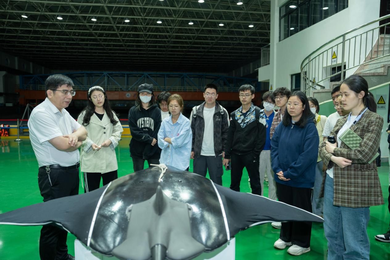 曾教授首先为大家介绍了航海公司的历史沿革、专业设置、研究方向,讲述了优秀员工的精彩事迹和取得的代表性成果,继而带领同学们参观翱翔重点实验室,讲解仪器设备、模型展项的相关数据和研发经历,让在场的每一位对出海测试、水下攻防、深海对抗等方面有了具体且生动地感知。在近一个小时充分热烈的互动环节中,同学们不仅围绕自身的研究兴趣向曾教授进行提问,还就人才培养、技术更新等方面同老师深入交流。曾教授对每一位同学提问都予以肯定并耐心解答,勉励大家积极学习、献身国防。