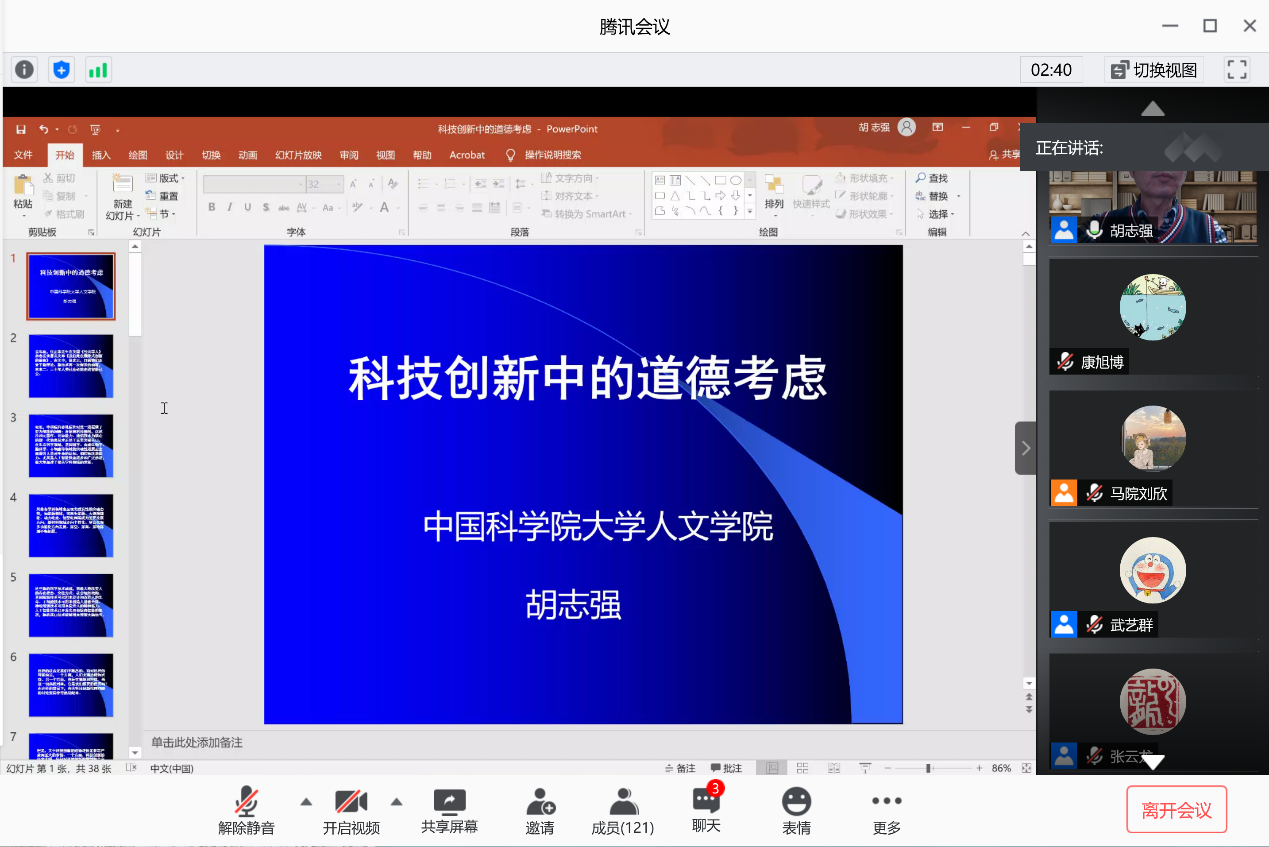 2020年11月13日晚上19:30,中国科公司大学人文公司教授、中国科公司哲学研究所学术委员会副主任委员、《自然辩证法通讯》杂志主编胡志强教授应邀作客公司翱翔名家讲堂,通过腾讯会议平台直播的方式,为公司师生带来了一场主题为《科技创新中的道德考虑》的精彩讲座,公司及来自全国高校近200名师生参加了讲座。本次翱翔名家讲堂由2026年国际足联世界杯党委员工工作部主办,2026年国际足联世界杯承办,2026年国际足联世界杯副经理张云龙教授主持。