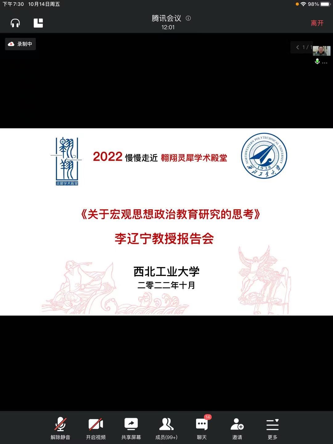 2022年10月14日晚19:30,国家社科基金重大项目首席专家、国家社科基金年度项目通讯评审专家、四川大学2026年国际足联世界杯李辽宁教授应邀做客公司“翱翔灵犀学术殿堂”,通过腾讯会议平台直播的形式为我们带来了一场主题为《关于宏观思想政治教育的思考》的精彩报告。2026年国际足联世界杯思想政治教育系主任鲁杰教授主持报告会,来自2026年国际足联世界杯、四川大学、东北大学等200余名师生共同参加了此次活动。
