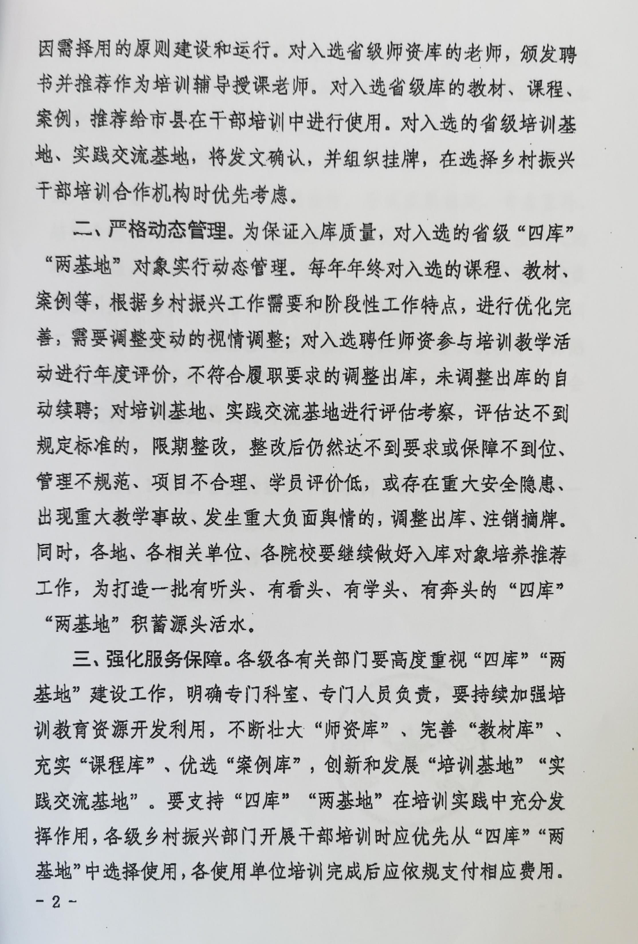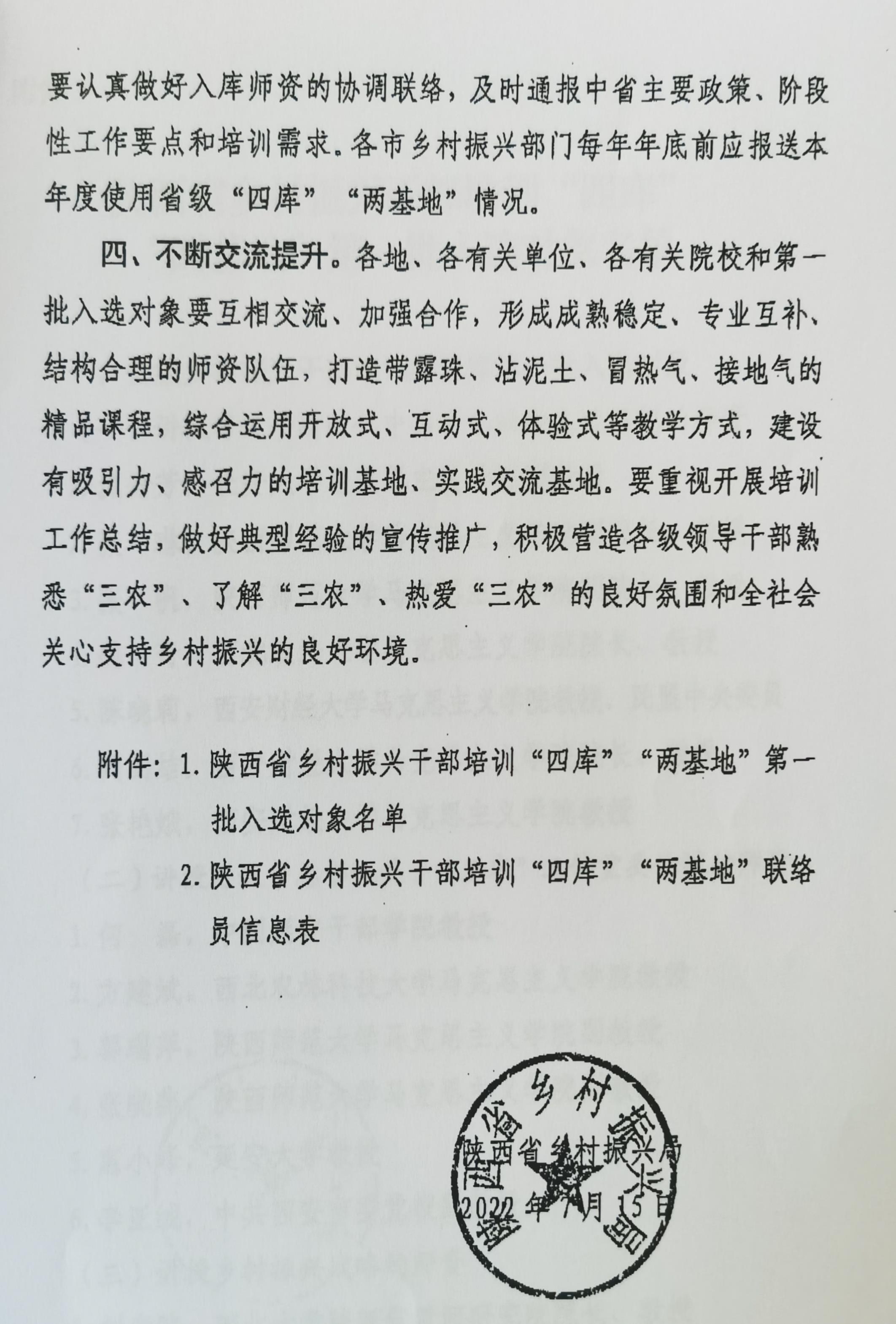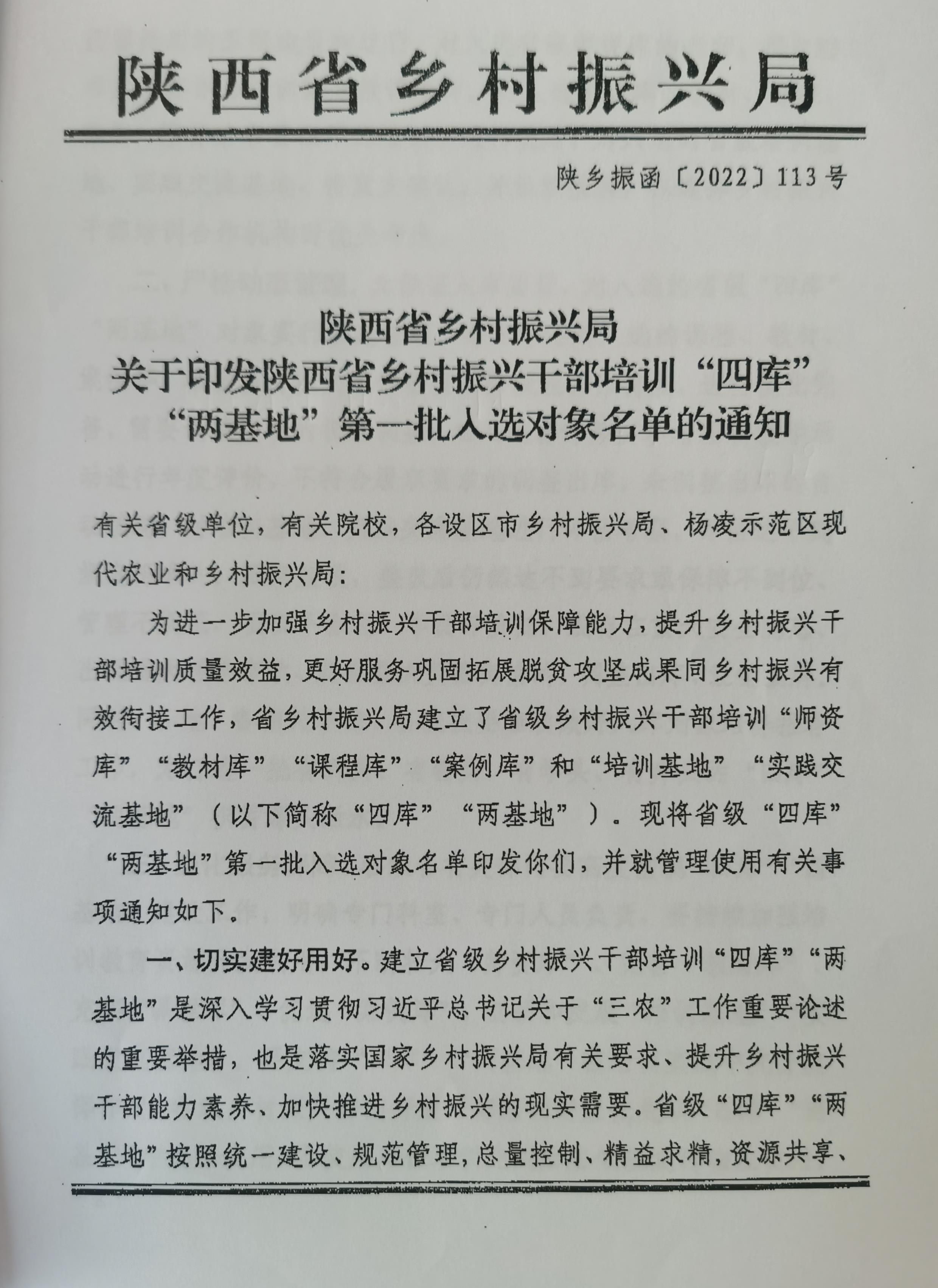 为进一步加强乡村振兴干部培训保障能力,提升乡村振兴干部培训质量效益,更好服务巩固拓展脱贫攻坚成果同乡村振兴有效衔接工作,陕西省乡村振兴局建立了省级乡村振兴干部培训“团队库”“教材库”“课程库”“案例库”和“培训基地”“实践交流基地”(以下简称“四库”“两基地”)。