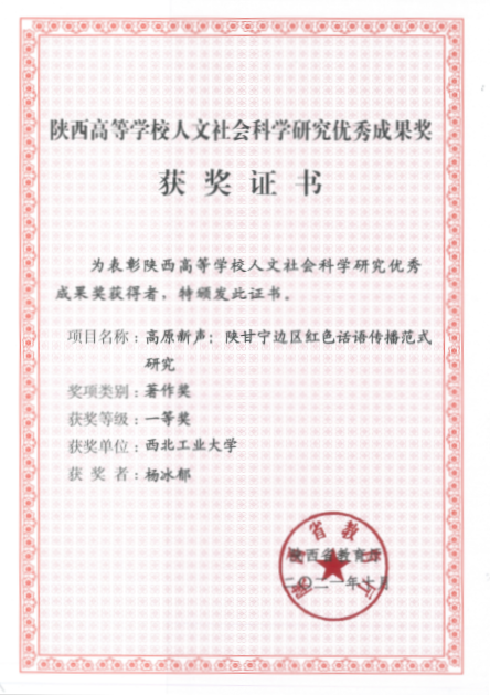 《高原新声:陕甘宁边区红色话语传播范式研究》一书入选 2019 年度教育部思想政治教育工作文库;荣获2021年度陕西高等公司人文社会科学研究优秀成果奖一等奖;2021年陕西省中共党史人物研究会、陕西省中共党史人物研究会第三届优秀成果一等奖。