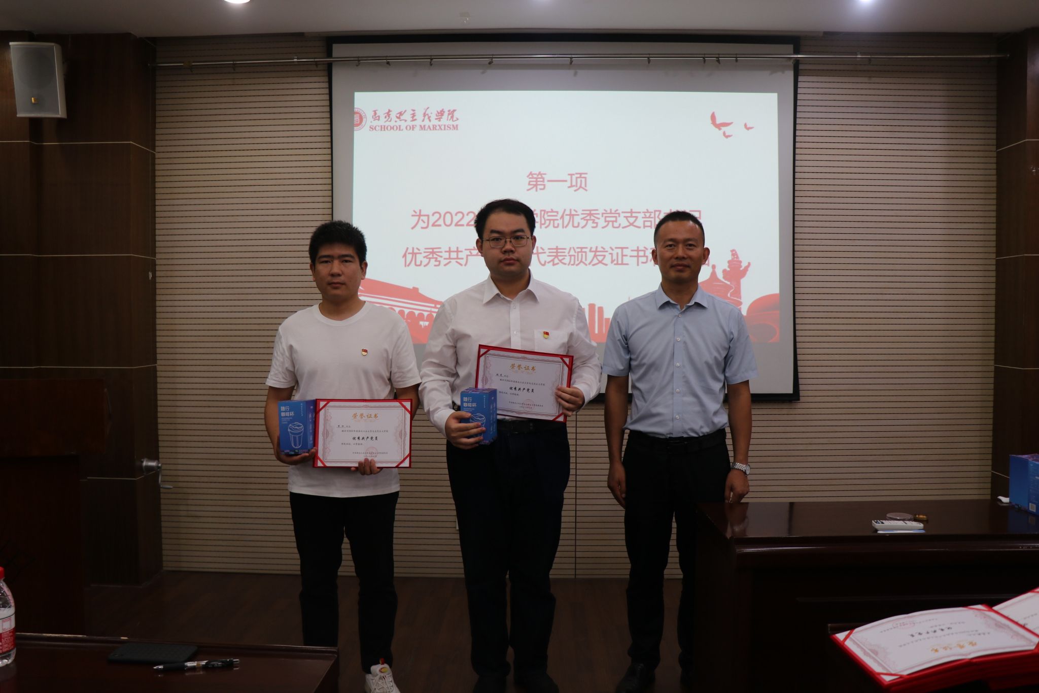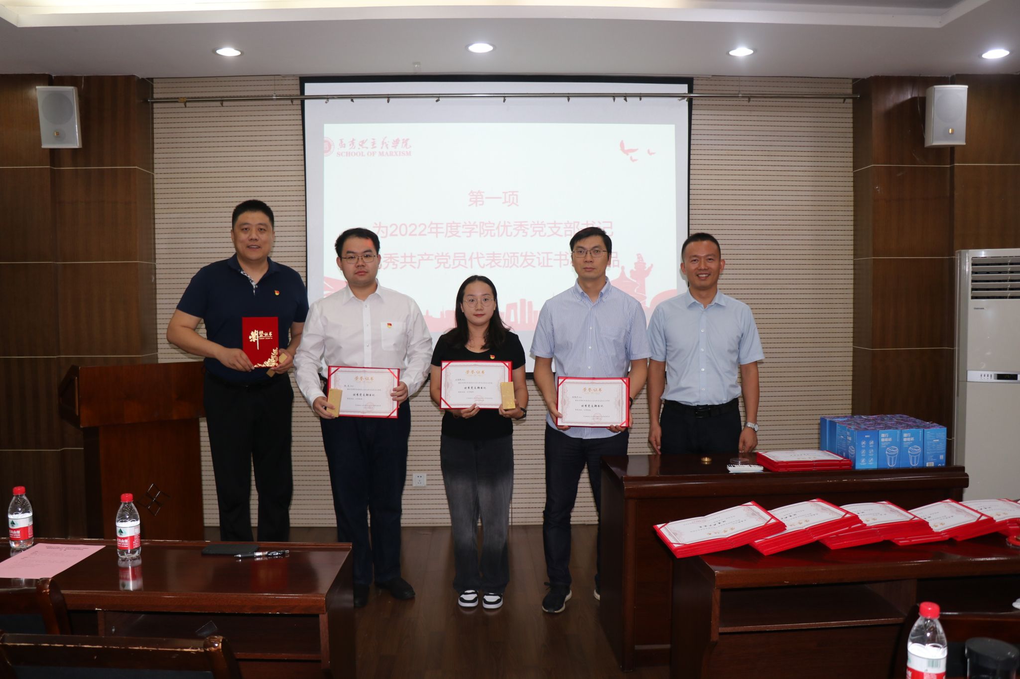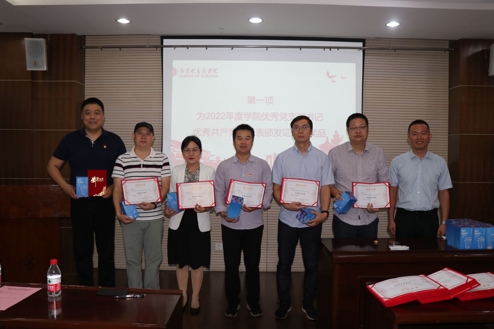 首先,蒲传新书记为2022年度公司优秀党支部书记李刚、陈诚平、王慧新、张昊,教工优秀共产党员代表杨永强、杨小勋、陈亚丽,员工优秀共产党员代表张昊、李水颁发证书和奖品,并对本次获奖的优秀教工党员18人,优秀员工党员36人表示祝贺。同时,蒲传新书记强调,证书是一份荣誉,更是一份激励,希望获奖同志为公司党建工作继续贡献力量。