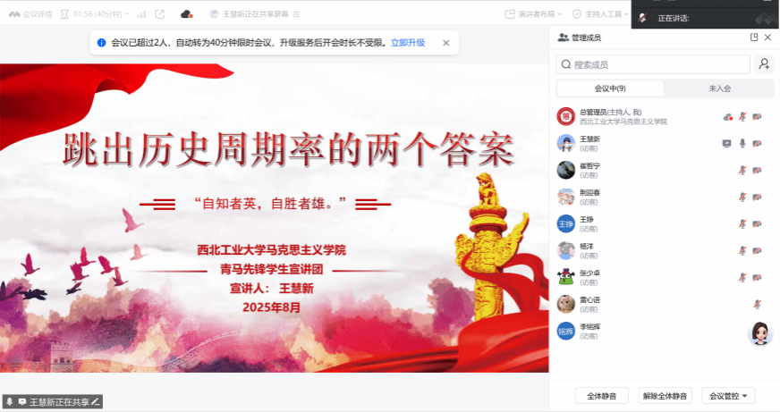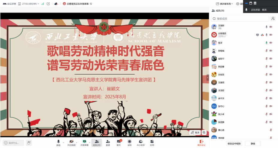 崔颖文同学带来了“歌唱劳动精神时代强音,谱写劳动光荣青春底色”的主题宣讲,围绕劳动精神的内涵、文化渊源、历史典故以及新时代青年的奋斗群像展开,她从自力更生,艰苦奋斗的“南泥湾精神”讲到崇尚劳动、热爱劳动、辛勤劳动、诚实劳动的劳动精神,从“躺平青年”讲到“有为青年”,深刻阐释了在新时代背景下,大力弘扬劳动精神对于青年成长成才的重大意义。宣讲内容既有理论深度,又紧密结合现实,引发了云端同学的深切思考。