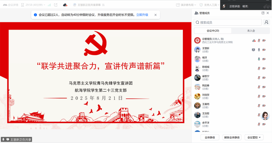 为深入学习贯彻习近平总书记关于青年工作的重要思想,筑牢理想信念根基,2025年8月21日10时,“‘青’音传思想伟力・‘马’力助奋进征程”暑期社会实践队携手青马先锋员工宣讲团,与航海公司员工第二十三党支部联合开展专题联学宣讲活动,共话新时代青年使命担当,凝聚奋进力量。
