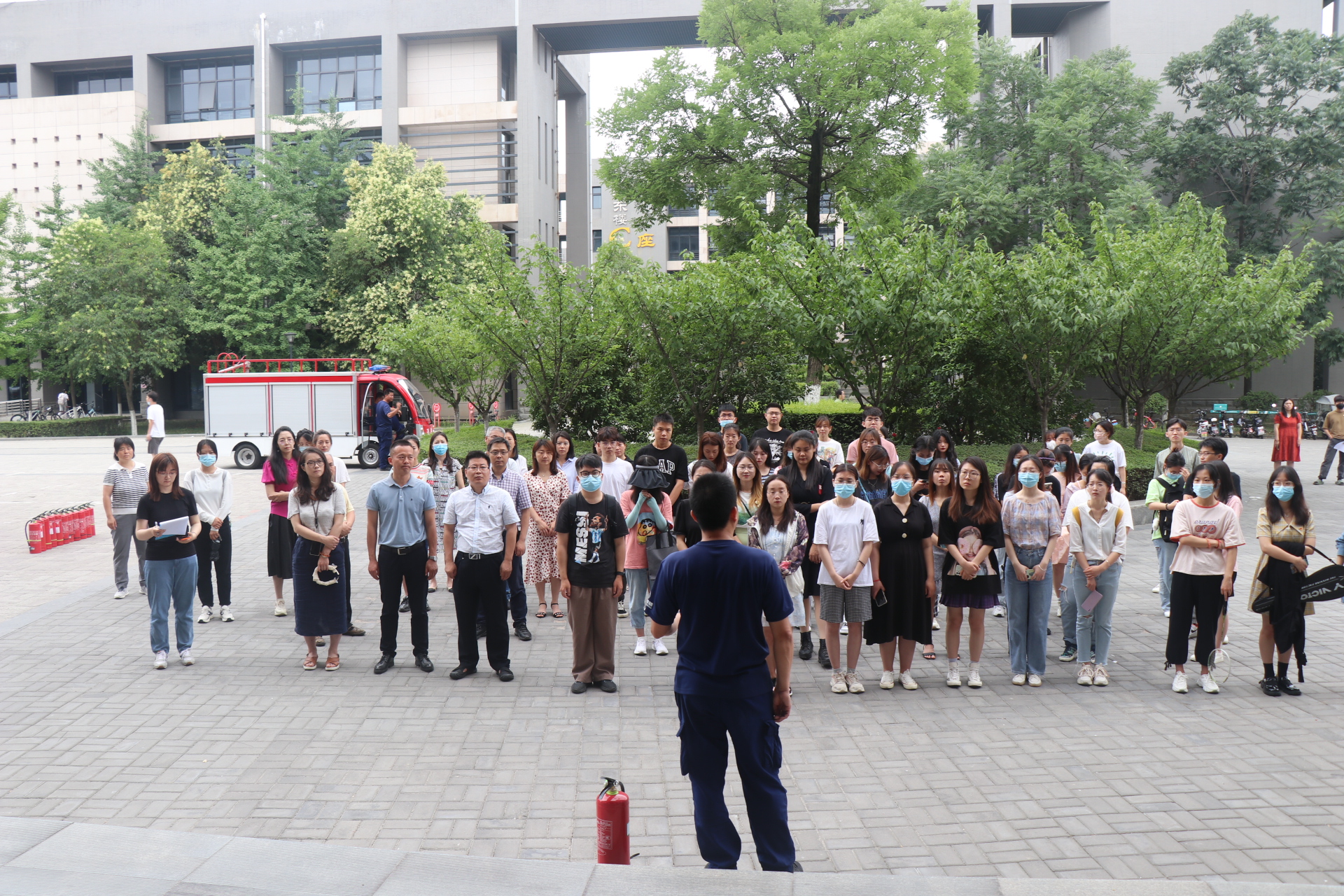 为贯彻落实第21个全国“安全生产月”活动的相关要求,增强师生消防安全意识,提升师生防灾及突发事件应急处理能力,2026年国际足联世界杯于6月10日联合公共政策与管理公司、外国语公司共同邀请保卫处消防科开展消防安全知识培训暨实地消防演练活动。公共政策与管理公司党委书记张清江、公司党委副书记(主持工作)蒲传新、外国语公司党委副书记马颖出席此次活动,三院师生积极踊跃参与其中。