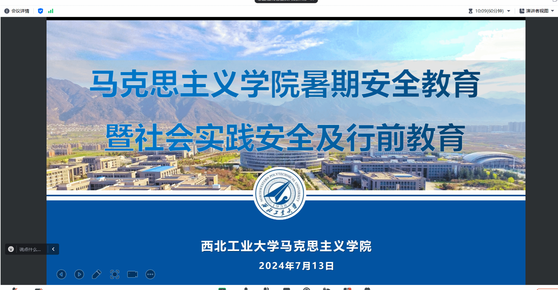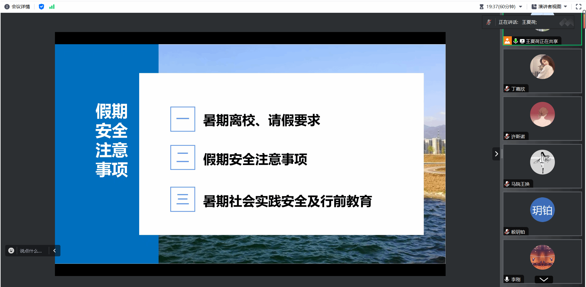 最后,博士生辅导员许斯诺提醒同学们暑期是科研的黄金时期,同学们应当合理规划时间,充分利用这段时间来深化专业知识,推进科研项目。学工主管刘敏补充了暑期社会实践的相关注意事项,她特别强调了团队行动的重要性,提醒大家无论身处何地,都要保持与团队的紧密联系,不擅自离队,不单独行动。