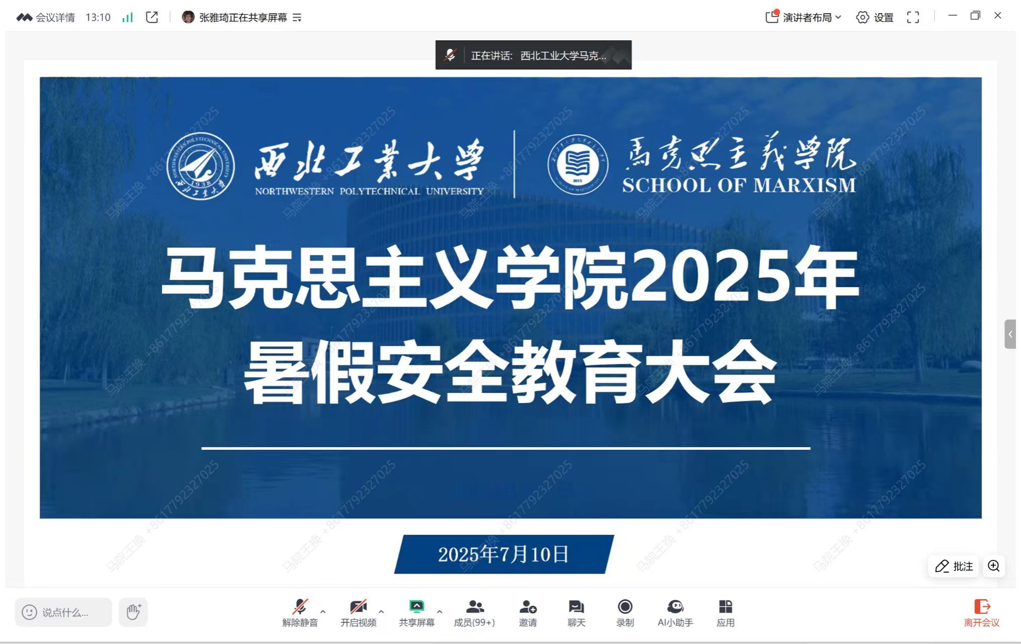7月10日21:00,公司线上召开暑假安全教育大会。会议由学工主管刘敏主持,公司党委副书记耿云辉,辅导员王换、许斯诺、本科生辅导员董润与全院同学共同参会。会议开始,刘敏详细说明暑假放假及开学时间安排,并对留校员工的管理细则进行细致解读。随后,王换围绕交通安全、饮食安全、人身财产安全几个方面强调暑期安全注意事项,为同学们的假期出行与实践活动划出安全底线。许斯诺通报近期高校热点新闻周报典型案例,结合案例引导同学们掌握科学的压力纾解方法,确保学业与身心状态齐头并进。最后,耿云辉传达公司员工工作会议精神,鼓励同学们利用假期提升综合素养,着重强调要做好身心调适,以积极心态应对挫折与各类心理变化。