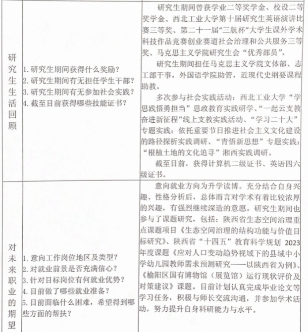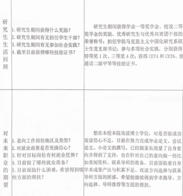 本次精准帮扶工作做到了有重点、有特点、有节点。帮扶老师通过和员工谈话,详细了解员工的基本信息、学业情况、就业创业意向、就业进展情况等,在此基础上,根据每位员工确定的就业意向,制定不同的帮扶方案,做到“一人一策”,筛选合适的就业信息传达给员工,达到了“点对点”服务的帮扶效果。同学们在谈话过程中也收获颇多,对当前马克思主义理论学科的就业形势、个人的就业方向、求职技能掌握等都有了全面的了解,开启了个人求职就业的第一站。