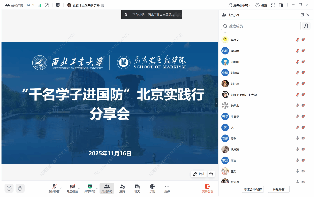 分享会上,六名参与“千名学子进国防”北京实践活动的员工代表,围绕就业选择、能力培养、学科价值等多个方面,分享了各自的访企实践感悟。2022级博士研究生李世文介绍了调研三家单位的基本情况,并结合与各单位人力资源负责人的座谈感受,鼓励同学们拓宽求职视野,打破专业局限,全面提升综合能力。2023级博士研究生沈守涛聚焦国企、央企就业方向,深入解读了行政岗位对复合型人才的需求,鼓励马克思主义理论专业员工树立专业自信,多元拓展就业路径。2023级硕士研究生褚星波阐述了马克思主义理论学科的思维优势,强调扎实的思维能力和坚韧的意志品质是职业发展的重要支撑。2023级硕士研究生刘丽萍结合实践经历,建议同学们积极参与多元活动,提升综合素养,拓宽就业视野,同时精准优化简历,增强求职竞争力。2025级本科生陆梦来分享了专业认知的转变过程,生动展现了文科研究的实践价值,并呼吁新时代青年积极承担网络安全责任。2025级本科生谢建年则强调了细节管理与核心就业能力的重要性,鼓励大家勇于尝试、敢于试错,主动转变员工思维,迅速适应职场环境。