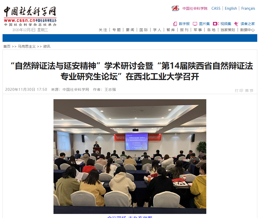 2020年11月30日,中国社会科学网报道公司“自然辩证法与延安精神”学术研讨会暨“第14届陕西省自然辩证法专业研究生论坛”召开情况。