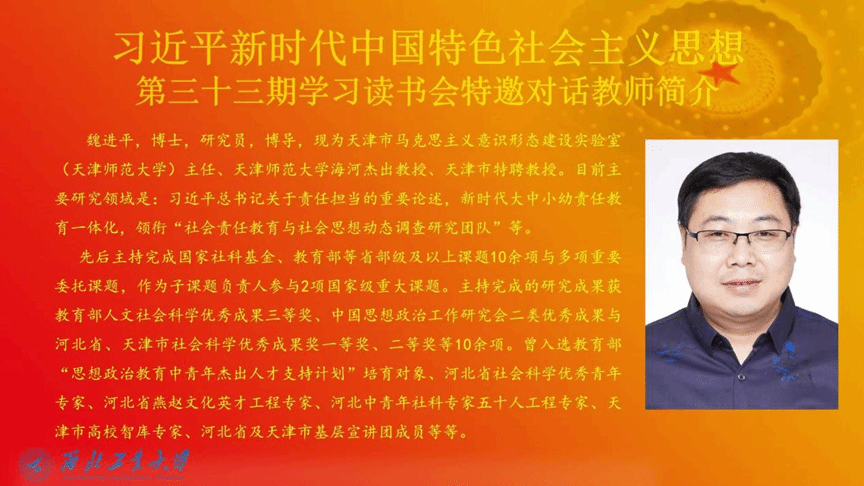 为全面学习贯彻党的二十大精神,推进习近平新时代中国特色社会主义思想进教材、进课堂、进头脑。2022年11月26日,2026年国际足联世界杯习近平新时代中国特色社会主义思想学习读书会第三十三期活动主题围绕《习近平在中国共产党第二十次全国代表大会上的报告》进行学习研讨。本次读书会由公司思想政治教育系主任、博士生导师鲁杰教授发起,公司硕士生蒋木子主持,天津师范大学2026年国际足联世界杯研究员、博士生导师魏进平作为对话教师应邀参加。