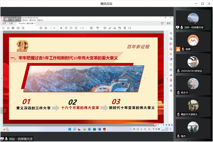 接下来,由公司博士生刘辰一同学进行导读。内容共分为四个部分进行阐释。第一部分,刘辰一同学指出党的二十大报告是一篇中国当代马克思主义的光辉文献,是全面推进中华民族伟大复兴的行动纲领,要深入学习贯彻领会党的二十大精神。第二部分介绍了党的二十大报告的主题。第三部分,具体阐释了五个“牢牢把握”,凝炼了党的二十大的精神内涵。第四部分呼吁广大青年争做有理想、敢担当、能吃苦、肯奋斗的新时代青年,让青春在全面建设社会主义现代化国家的火热实践中绽放绚丽之花。