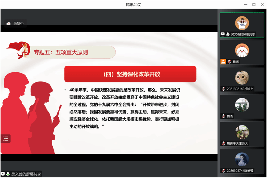 读书会的第一位导读人是公司硕士生吴文蓉同学。她从一个现代化、第二个答案、三大要素、四个自信、五项重大原则五个专题展开。首先是一个现代化。吴文蓉同学从多维度介绍了中国式现代化的内容,指出中国的发展不是通过剥削他国,而是通过发展自己实现现代化,与西方现代化有本质区别。在第二个答案专题中,强调自我革命是党跳出治乱兴衰历史周期率的第二个答案,自我革命是党永葆生机活力的强大支撑、是党站稳人民立场的集中彰显、是党引领社会革命的重要保障。第三个专题是三大要素。从科教兴国、人才强国、创新驱动发展战略入手,强调教育、科技、人才是全面建设社会主义现代化国家的基础性、战略性支撑。第四个专题是四个自信。吴文蓉同学指出坚定道路自信,为人类探索更好社会制度提供实践途径;坚定理论自信,为人类探索更好社会制度提供科学指南;坚定制度自信,为人类探索更好社会制度提供参考借鉴;坚定文化自信,为人类探索更好社会制度提供中国智慧。最后一个专题是五项基本原则,即坚持和加强党的全面领导、坚持中国特色社会主义道路、坚持以人民为中心的发展思想、坚持深化改革开放和坚持发扬斗争精神,鼓励当代青年在勤学敏思中不断增长才干,在社会实践中不断磨砺自我,在肩负时代重任中行胜于言,在真刀真枪的实干中成就一番事业。