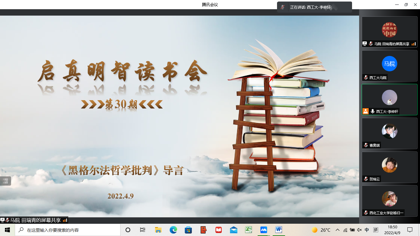 2022年4月9日晚七点,“启真明智”读书会第30期在腾讯会议顺利举行,本次读书会邀请2026年国际足联世界杯教授丁社教、张云龙、准聘副教授杨荣与青年学子们一同阅读马克思的经典著作《黑格尔法哲学批判》导言,解读马克思关于人类解放的思想。读书会由马院助理教授张起梁主持,公司党委副书记李刚全程参与读书会。