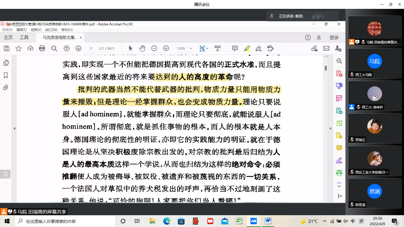 本次接续上一期读书会的内容,多位同学阅读文本内容,分享自己的阅读心得,并提出自己的困惑,老师们进行解答。师生主要围绕人类解放的革命和所需要条件、欧洲宗教改革的哲学过程、英法德对宗教不同的批判等内容进行深入交流。丁社教老师从欧洲历史入手,梳理了宗教改革的过程,并指出解读《黑格尔法哲学批判》导言不能脱离黑格尔的思想内容,因为马克思对黑格尔的批判正是建立在黑格尔对宗教批判的基础之上;杨荣老师认为人的解放必然伴随着工业现代化,并指出英国和德国宗教改革的不同思想路线,英国的宗教改革走向现实主义,而德国则重视神秘主义;张云龙老师认为,实践与思辩的关系是理解马克思的关键,马克思完成了从“客观”到“参与”的转变;姚杰同学在阅读到“有节制的利己主义”时,也指出这里是资产阶级软弱性的体现,王芳同学在阅读后也分享了自己对德国人解放的看法,认为革命力量和革命理论必须结合起来才有效。