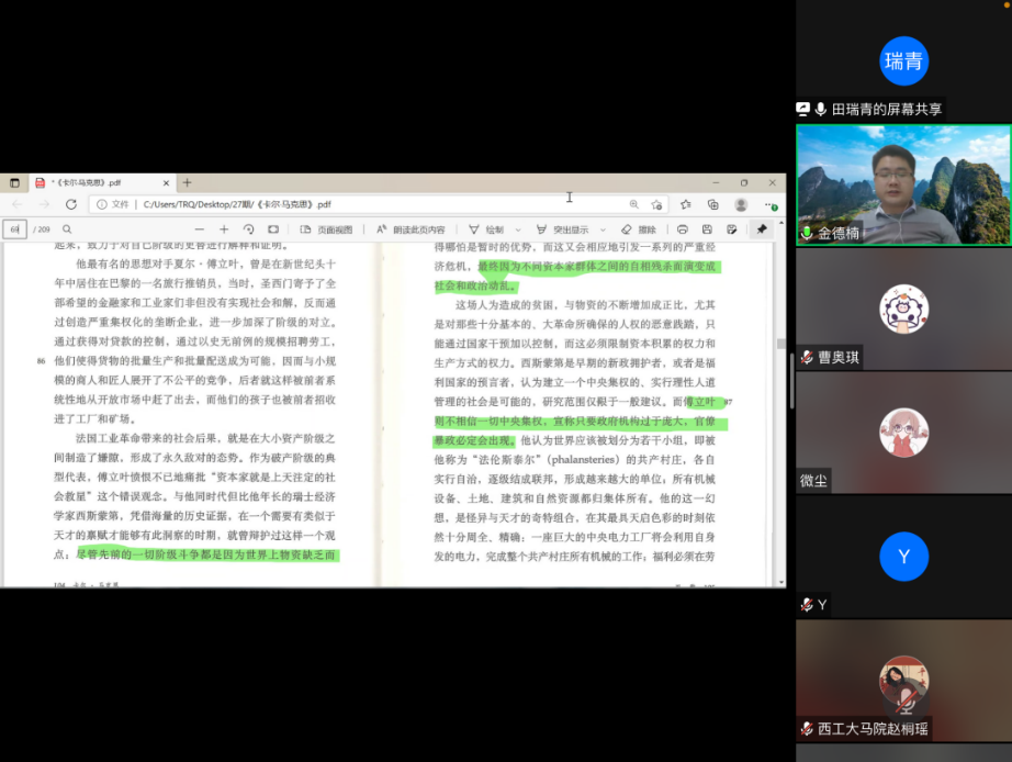 首先,杨永强介绍了金德楠老师的简历,并对金老师的到来表示欢迎。研究生黄奕彩、张晨娅、赵桐瑶、李仲轩和田瑞青先后阅读文本内容,表达了对所阅读内容的理解,并提出了一些针对性的问题,老师们对员工提出的问题进行了解答。师生们围绕圣西门和傅立叶的空想社会主义思想、“集权”和“极权”的区别、自由主义和社会主义的对立、人的解放的三种方式、马克思“两个转变”的重要性和局限性以及写作中的“言不及意”和阅读中的“意所难及”现象进行了深入的交流。