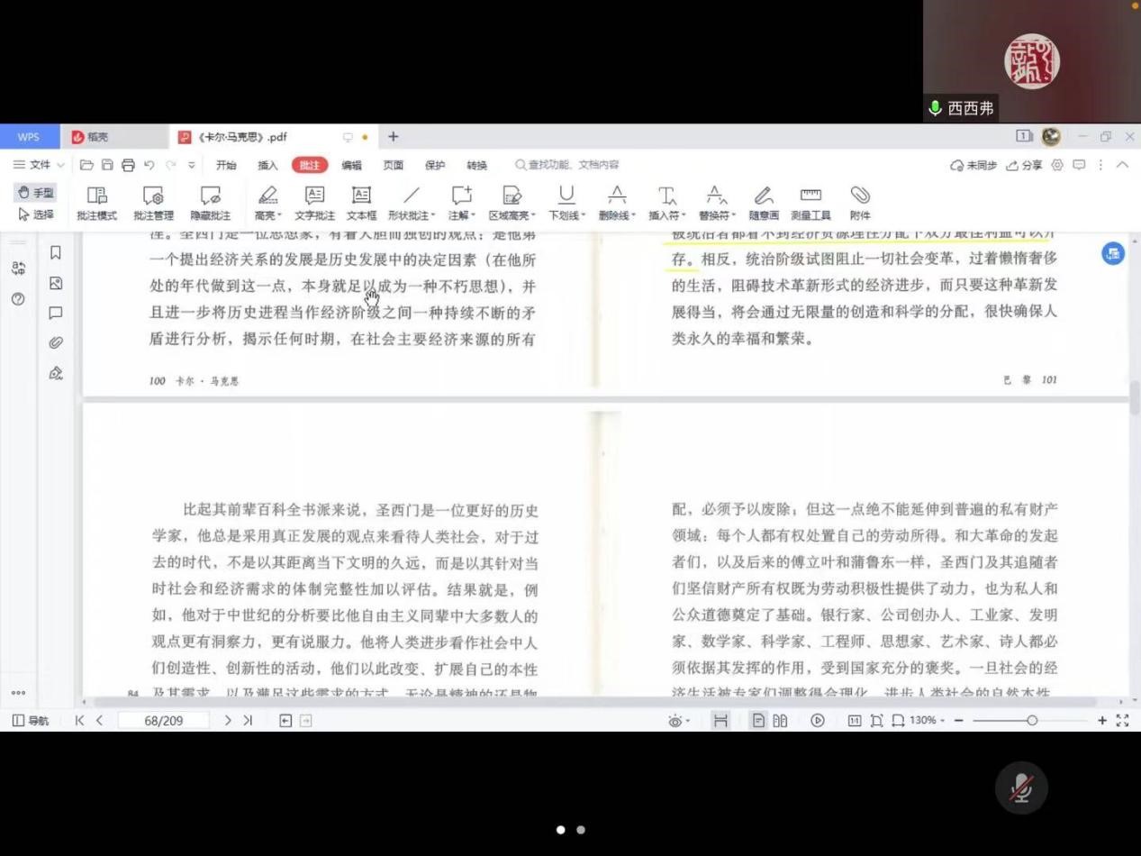 首先,硕士生李仲轩、李红梅、李潇、王菲等先后阅读书本内容,表达了对所阅读内容的理解,并提出了一些针对性的问题,三位老师对员工提出的问题进行了解答。师生们针对马克思在法国巴黎生活的时代背景及其对马克思思想形成的影响、实证主义和观念论的对立、法国和德国思想环境的对比、法国空想社会主义是马克思思想的来源等方面进行了深入的交流。