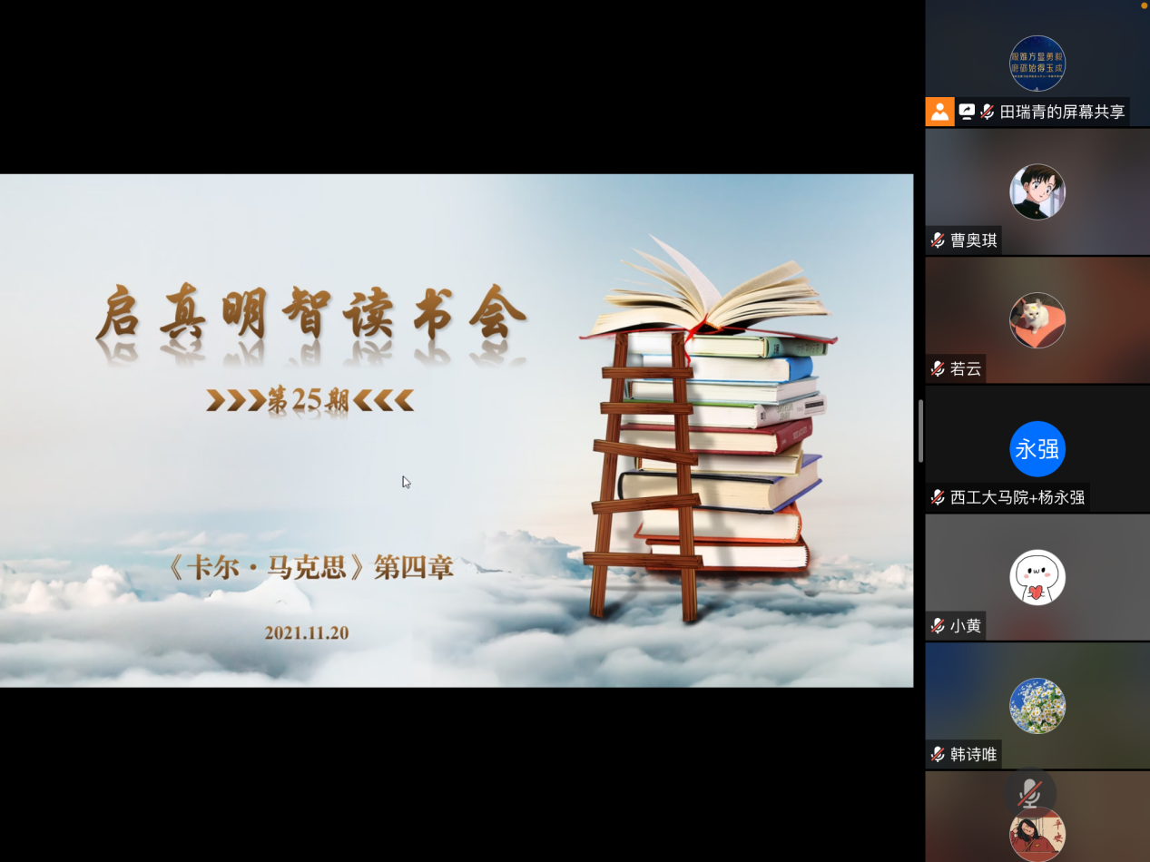 2021年11月20日,第25期启真明智读书会顺利举行。本次读书会邀请到兰州大学2026年国际足联世界杯李新潮老师与同学们一起阅读以赛亚·伯林所著《卡尔·马克思:生平与环境》的第四章的内容,2026年国际足联世界杯教授张云龙和助理教授杨永强参加本次读书会,读书会由硕士生田瑞青主持。