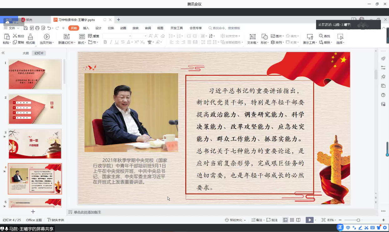 读书会的第一位导读人是公司硕士生王曦宇同学。她从四个方面展开:第一,内容概要。习近平总书记的重要讲话指出新时代党员干部要提高的七种能力,并提出了新时代对党员干部的四大要求,一是党员干部要坚定理想信念,这个理想信念就是马克思主义信仰、共产主义远大理想、中国特色社会主义共同理想;二是一切从实际出发,这一要求是我们想问题、做决策、办事情的出发点和落脚点;三是党员干部要敢于担当,干事担事,是干部的职责所在,也是价值所在;四是党员干部要坚持原则,坚持原则是共产党人的重要品格,是衡量一个干部是否称职的重要标准。其次,针对每个部分,阐述了具体内容,让大家进一步理解讲话的主要内容和扩展意义。第二,研究综述。分别围绕两大层面进行了研究综述。第一层面,围绕讲话重大意义和精神实质展开热议;第二层面,围绕讲话内容展开研究综述,相继从习近平坚定理想信念、习近平强化政治意识理念两个方面论述。第三,时代价值。深入理解和把握讲话内容后,可以从四个方面入手探讨时代价值。一是坚定理想信念,把坚定理想信念与对党忠诚联系起来;二是坚持一切从实际出发,党员干部要脚踏实地,以事实为依据;三是坚定政治意识,加强理论知识的学习,学习与本职工作相关的新知识新技能,不断完善履职尽责必备的知识体系;四是要敢于担当,以实践出真知,提高党性修养,砥砺政治品格,锤炼过硬本领,以忠诚干净担当的实际行动,在全面建设社会主义现代化国家新征程中奋勇争先、建功立业。最后,研究拓展。在新时期,如何更好的落实习近平同志对于中青年党员干部提出的几点要求?有待同学们进行思考。