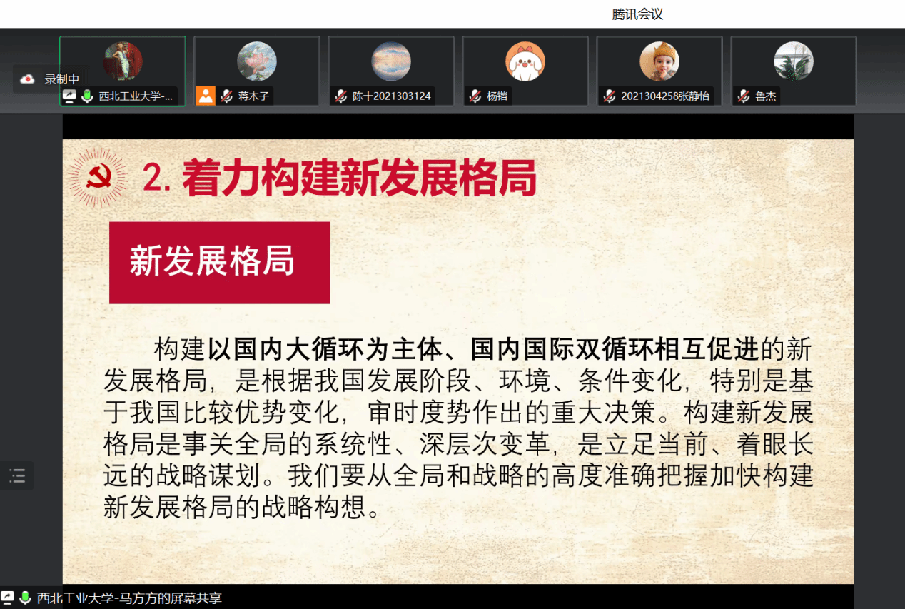 接下来,由公司硕士生方译莹同学进行导读。她把内容分为四个部分进行阐释。第一部分,方译莹同学讲述了这一重要讲话的背景内容,习近平总书记提出新发展理念已有五年,各方面已形成高度共识,实践也在不断深化。第二部分是对文本内容从五个方面进行了全方位多维度的解释。第三部分,具体阐释了对构建新发展格局的深入研究,从重大意义、优势条件和制约因素、实践路径进行了讲述。最后一部分对文本内容进行了总结,要正确认识国际国内形势,全面把握新发展阶段,从全局和战略的高度准确把握加快构建新发展格局的战略构想,并要把握好几个重要着力点,提高党领导贯彻新发展理念、构建新发展格局的能力和水平。