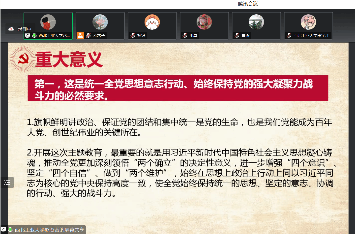 读书会的第一位导读人是公司硕士生赵姿蓉同学。第一个部分首先是从世情、国情、党情等方面来对此次主题教育的背景进行阐述:中国发展壮大,美国越来越“不安”;新时代需要新理论解决好高质量发展问题;解决大党独有难题。在对开展这次主题教育的重大意义进行理解时,除了对文本上的三个重要意义进行解释,更是引用了专家学者的研究论述,对习近平新时代中国特色社会主义思想的世界观方法论展开论述。第三部分是开展这次主题教育的目标要求,首先要牢牢把握总要求,其次要全面落实重点措施,最后是要紧紧锚定目标任务。第四部分是开展历次党内集中学习教育的意义,通过文本内容,结合专家学者有关党内集中教育的研究论述,从党内集中教育历史演进;开展党内集中教育的作用和意义研究;关于党内集中教育特征研究;关于党内集中教育的经验借鉴研究四个方面进行了自己的理解。