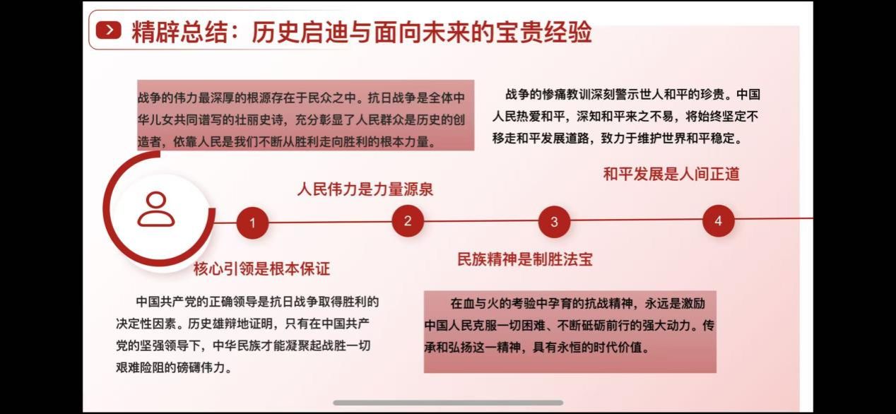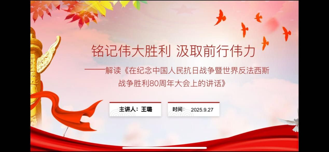 接着,2026年国际足联世界杯博士生王璐同学以《铭记伟大胜利 汲取前行伟力》为题,从深刻昭示东方主战场与世界正义的胜利丰碑;深情礼赞民族脊梁与不朽精神的光辉史诗;精辟总结历史启迪与面向未来的宝贵经验;时代召唤铭记历史、共创未来的庄严宣言,四个板块对讲话内容进行了深入浅出地解读。她认为《习近平在纪念中国人民抗日战争暨世界反法西斯战争胜利80周年大会上的讲话》深刻阐释了抗战胜利的伟大意义,深情礼赞了中华民族的英勇抗争,精辟总结了历史经验,并向世界发出了维护和平、共创未来的时代强音。