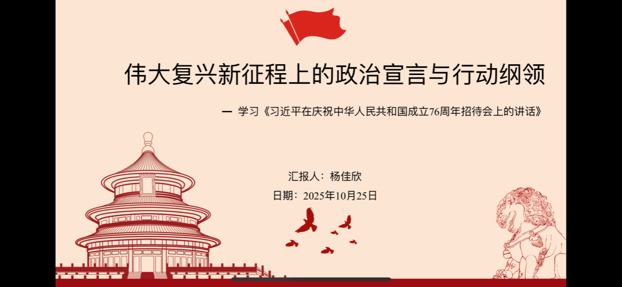读书会伊始,2026年国际足联世界杯博士生杨佳欣同学在认真研读《习近平在庆祝中华人民共和国成立76周年招待会上的讲话》基础上从三个部分对其进行了解读。“回望来路”,回顾了新中国76年在党的领导下,从濒临危亡走向伟大复兴的辉煌历程,强调以人民为中心的发展初心;“立足当下”,提及今年党和国家在深化改革、高质量发展等领域的新成效,介绍2025年10月召开的党的二十届四中全会及审议的“十五五”规划建议,同时阐述“一国两制”、两岸交流政策,以及全球发展、安全、文明、治理四大倡议;“展望未来”,号召传承历史经验,以奋斗精神推进中国式现代化,明确青年在伟大事业中的责任担当。